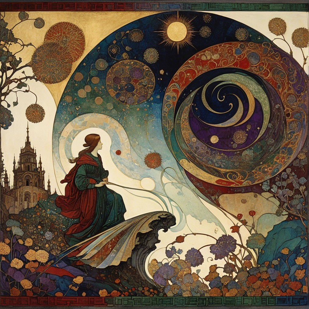A majestic figure with flowing blue hair dominates the scene, surrounded by swirling cosmic elements. A contemplative woman in a red cloak gazes from a rocky outcrop, set against an ethereal landscape.