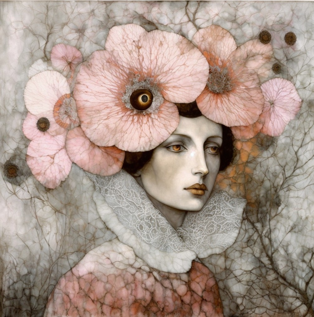 A mysterious portrait of a woman adorned with an elaborate hat resembling an owl, featuring delicate pastel colors and intricate fabrics, evoking a blend of elegance and whimsy.