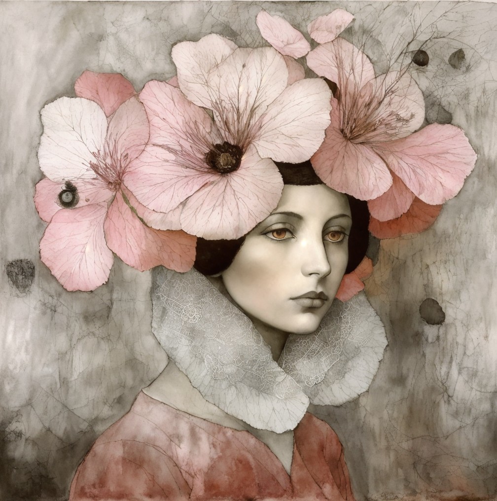 + Prompt:Emerging chrysalis. foggy nostalgia, portrait in Burnt umber and salmon gold, smoke and mirrors, patina of, battery acid, art brut, moody, somber, desaturated colors, in the style of Paul Klee, Arthur Rackham Dark and moody oil painting of a woman with piercing black eyes, inspired by the works of John Singer Sargent and Edgar Degas, long shot, realistic texture, dramatic lighting, intricate details on clothing and Magical woman fading tones of melancholy and summer nostalgia, soulful portrait, in burnt umber, plutonium, patina of mercury glass, tea stains, art brut, moody, somber, desaturated colors, in the style of Paul Klee, Banksy, Arthur Rackham, based on Prompt by KRW