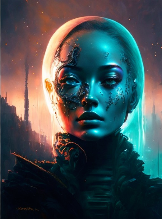 A futuristic female cyborg with a partially metallic face and glowing blue eyes set against a neon-lit city backdrop.