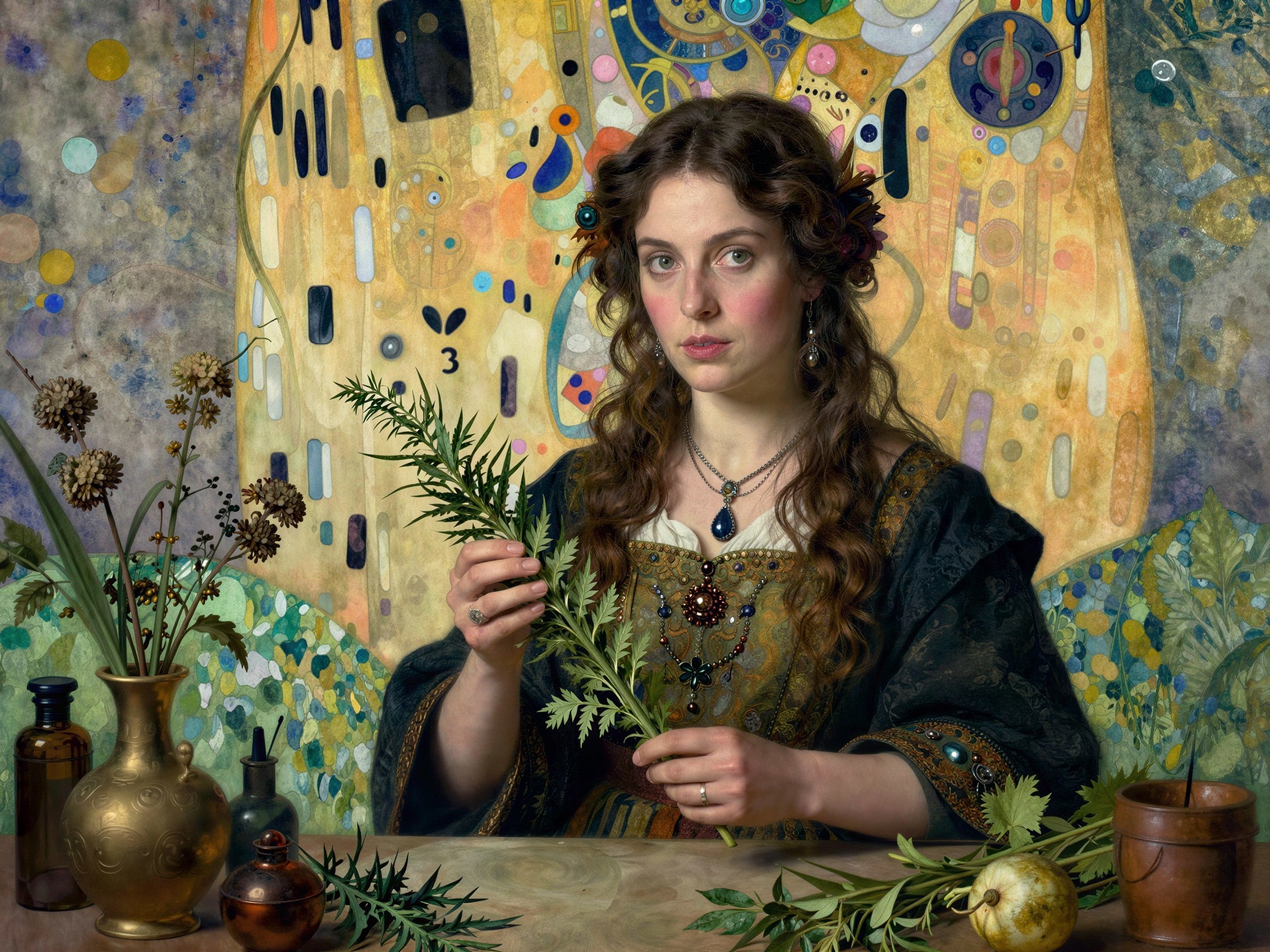 An elaborate digital painting depicts a dark-skinned woman with large black braids, wearing a dark blue shirt with gold patterns and numerous ornate beaded necklaces, with numerous items in the background and foreground, including an ornate golden lamp, plants, an antique vase, and small bottles filled with various ingredients. The woman