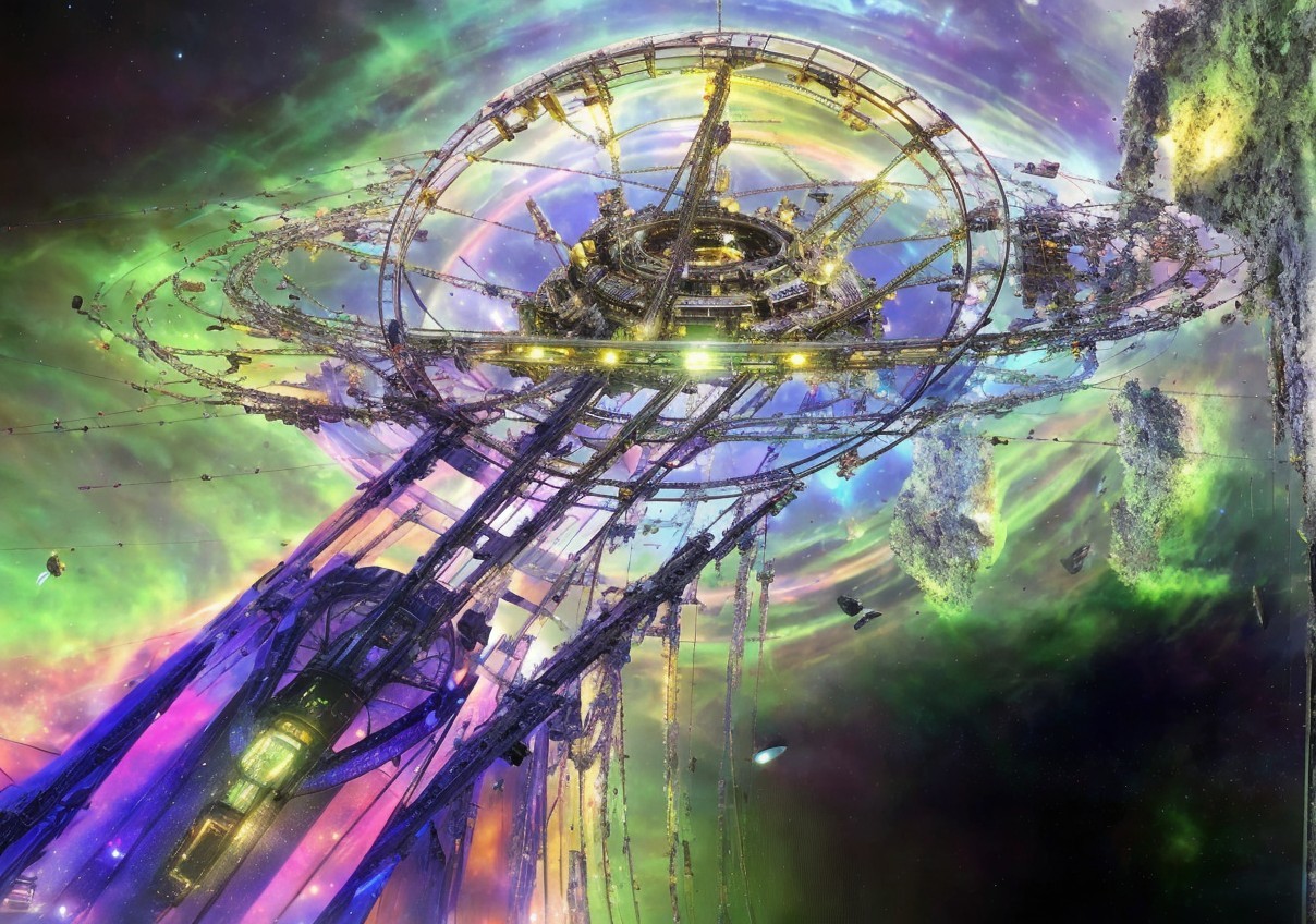 An intricate space station with rotating rings amid a colorful nebula backdrop.