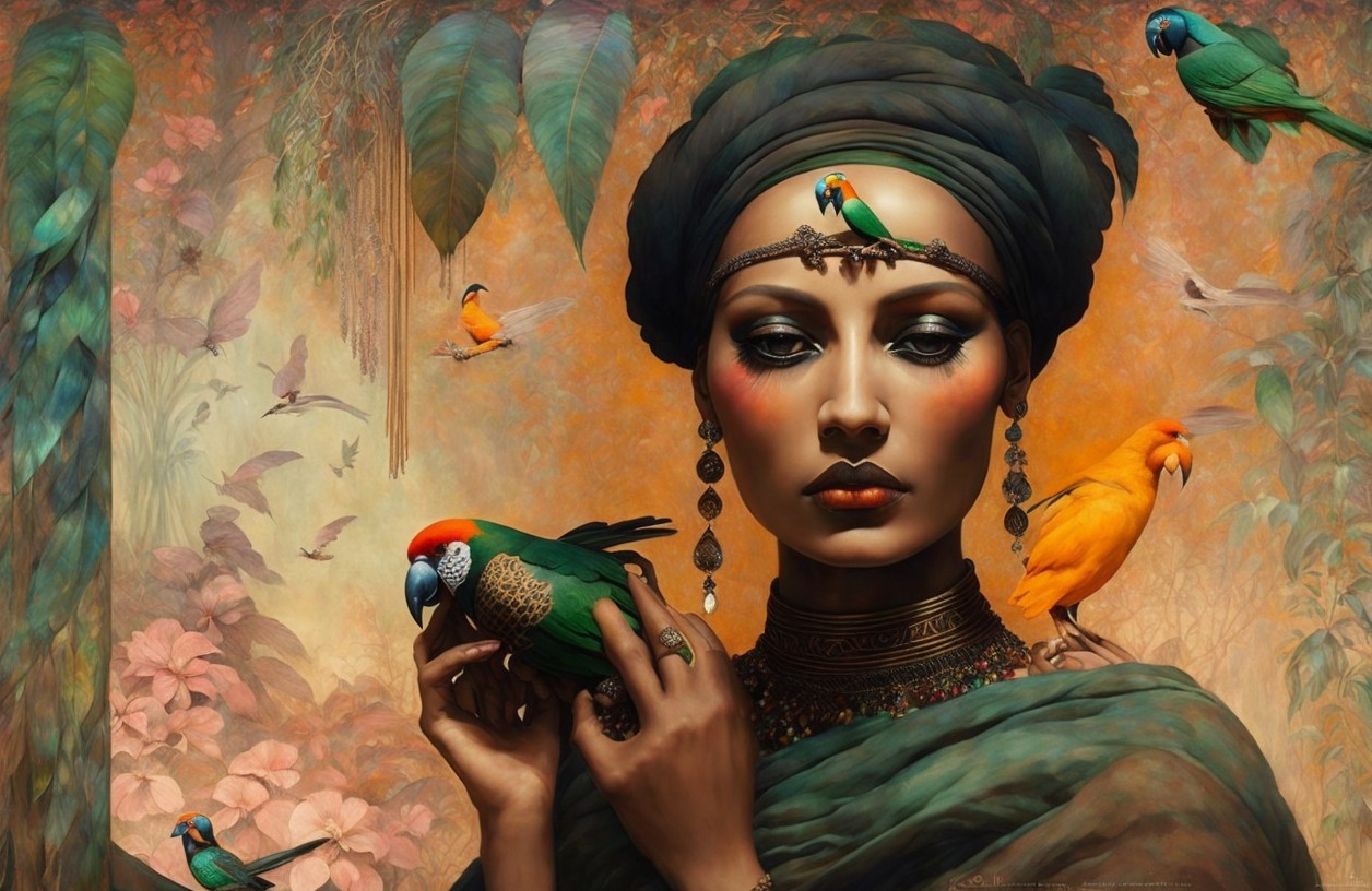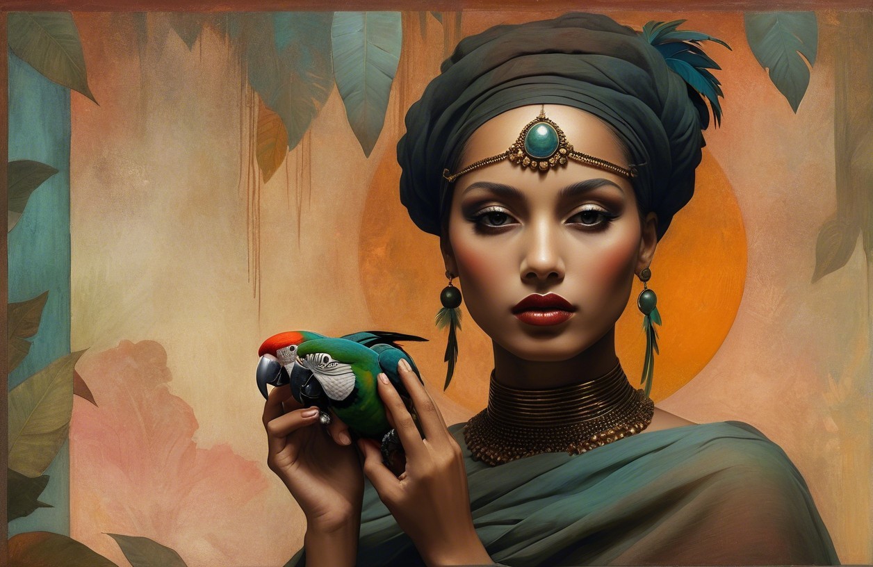 A captivating woman adorned with intricate jewelry and a stylish headscarf poses with a vibrant parrot. The warm backdrop features lush foliage and a glowing sunset, enhancing the exotic atmosphere.