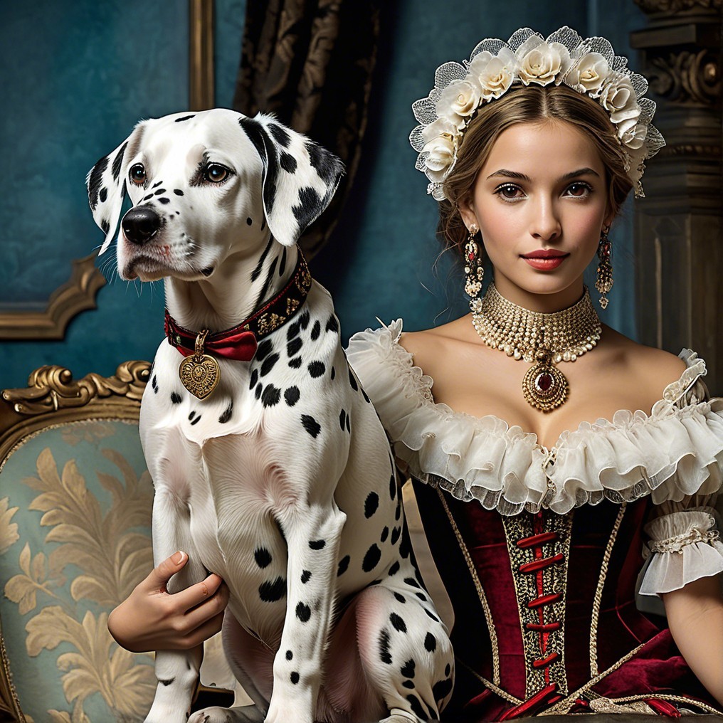 Three Dalmatian dogs are depicted in a serene, natural setting. One wears a decorative collar, while the others sit attentively, surrounded by greenery and softly lit by gentle sunlight.