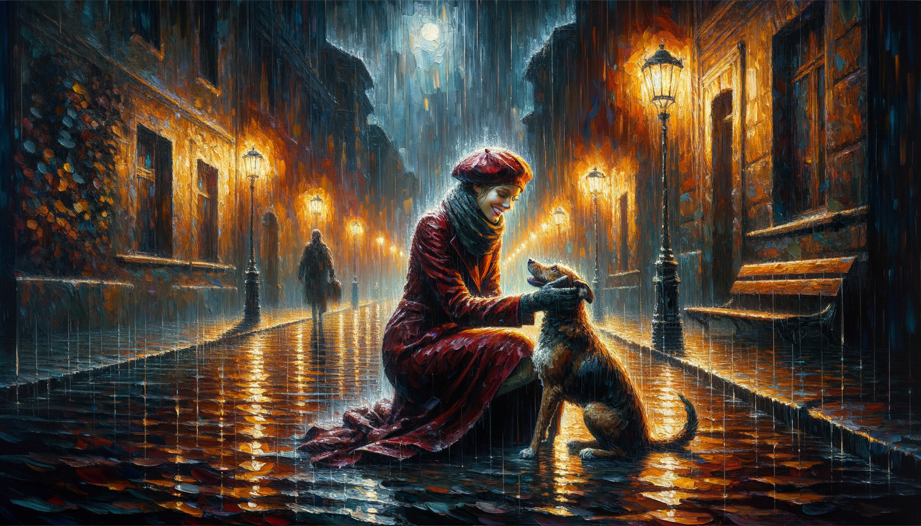 A woman in a red coat pets a wet dog on a rainy, lamp-lit street.