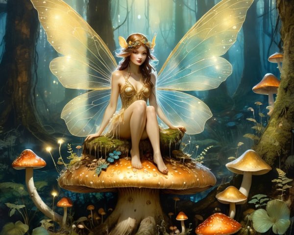 A serene, fairy-like figure with flowing, pastel hair adorned with flowers. She wears an elegant, green-embellished gown, surrounded by blooming flowers and delicate birds in a magical, soft-lit landscape.