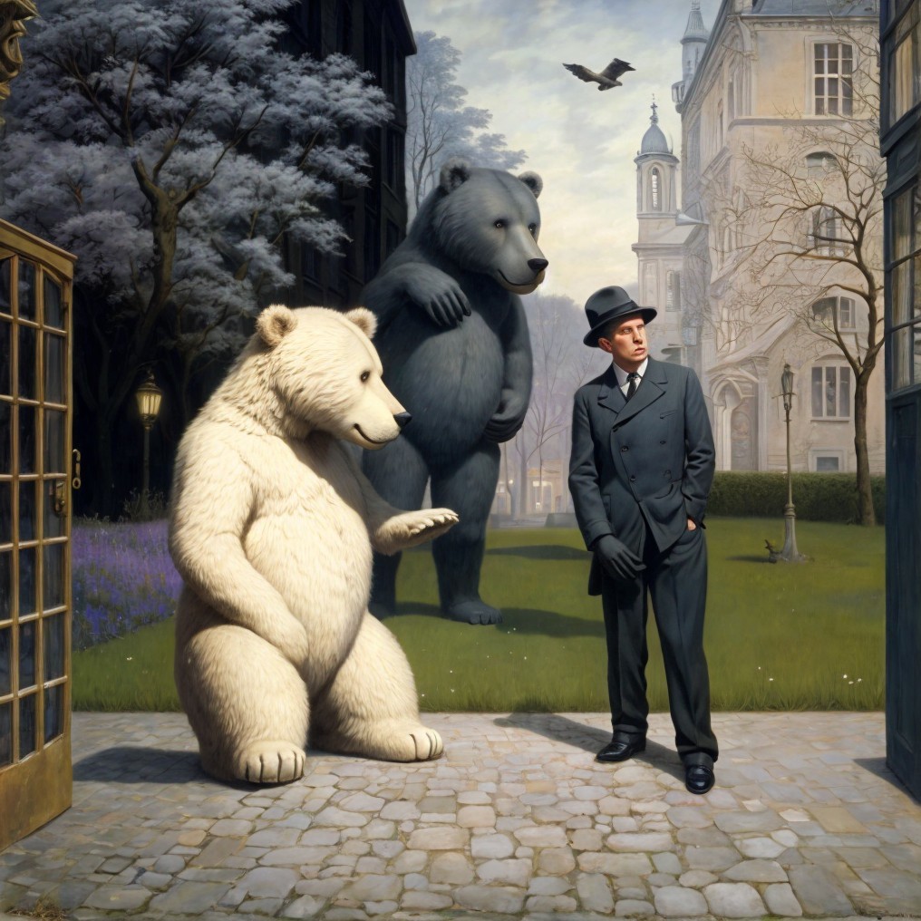 Man in Suit Observes Bears at Open Doorway