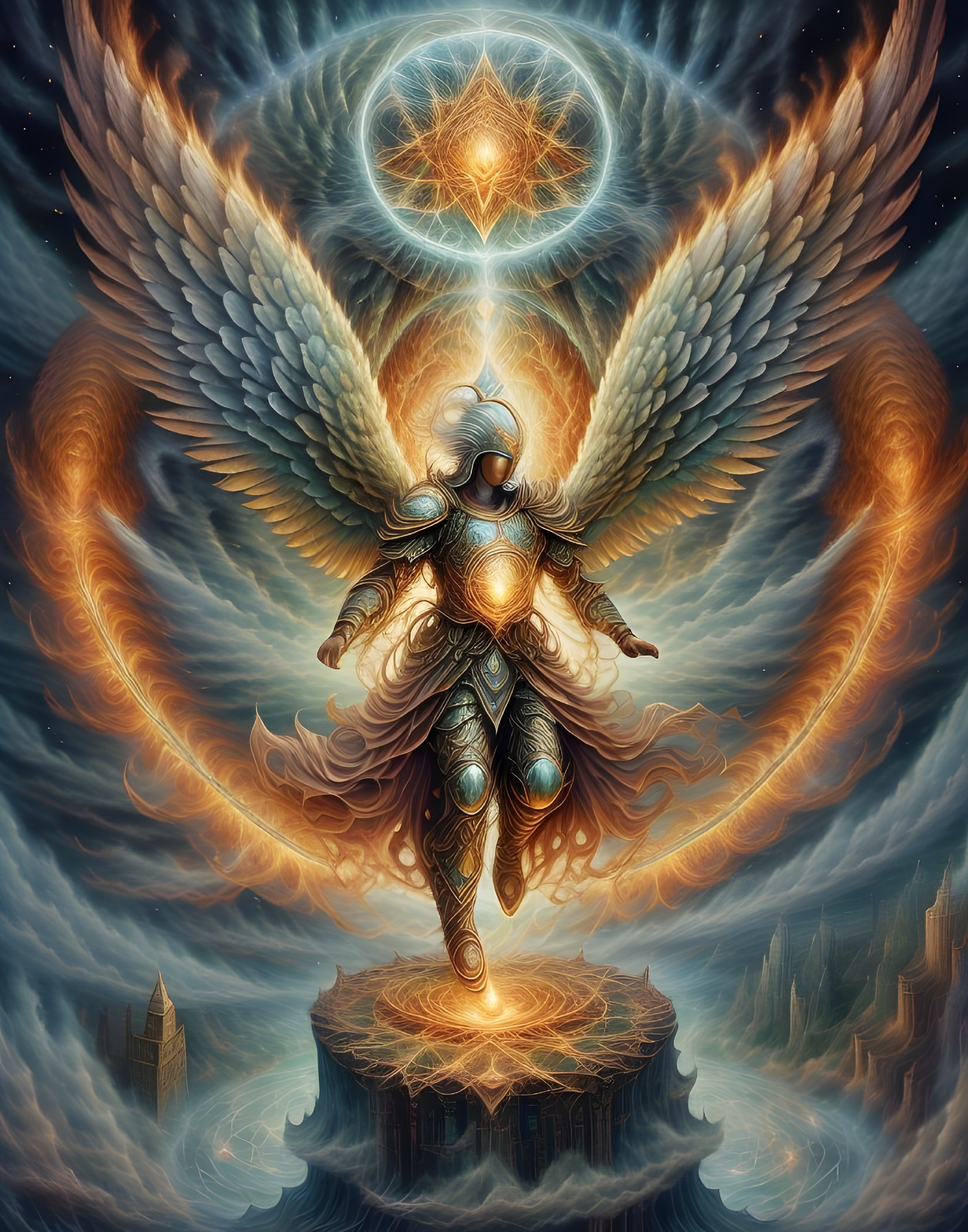 An angelic figure in armor emanates light, with majestic wings spread against a swirling celestial backdrop, exuding a powerful, magical aura.