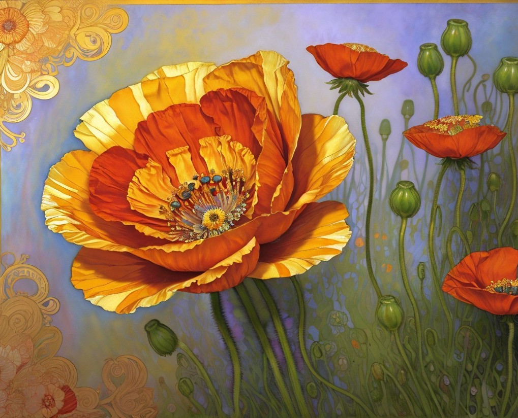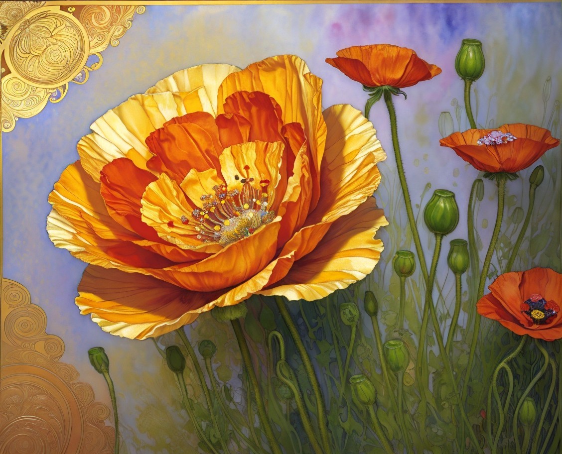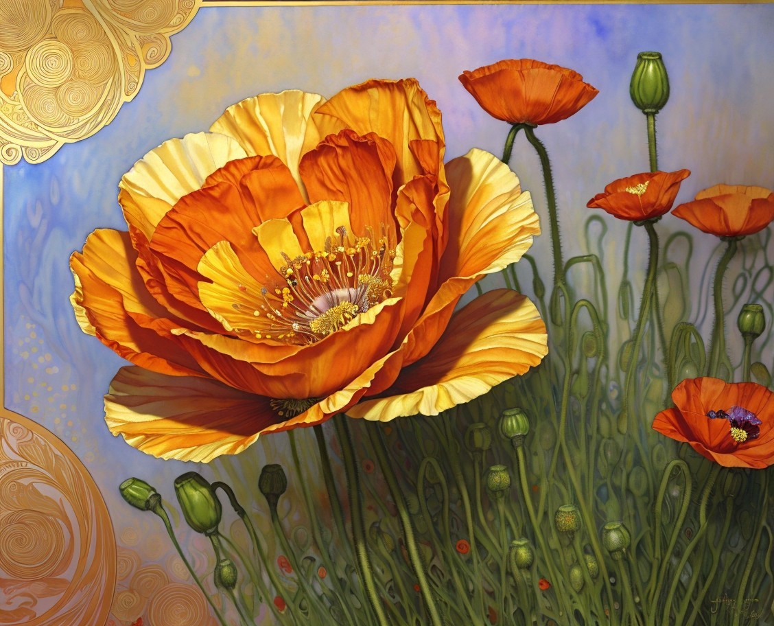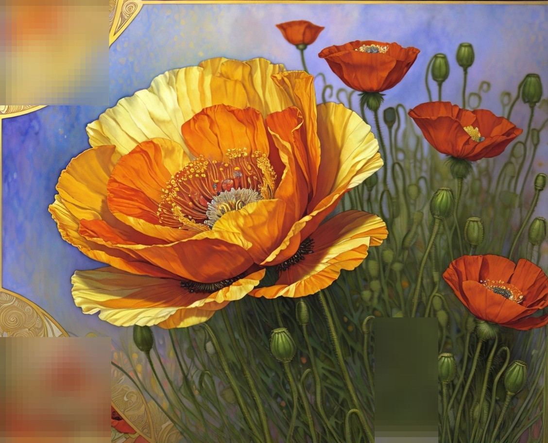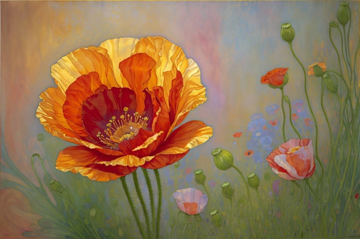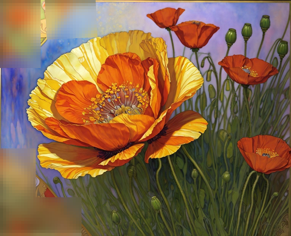 A vibrant illustration of orange and yellow poppies, set against a soft, colorful background. The blossoms feature intricate details, while buds and stems create a lush, lively arrangement.