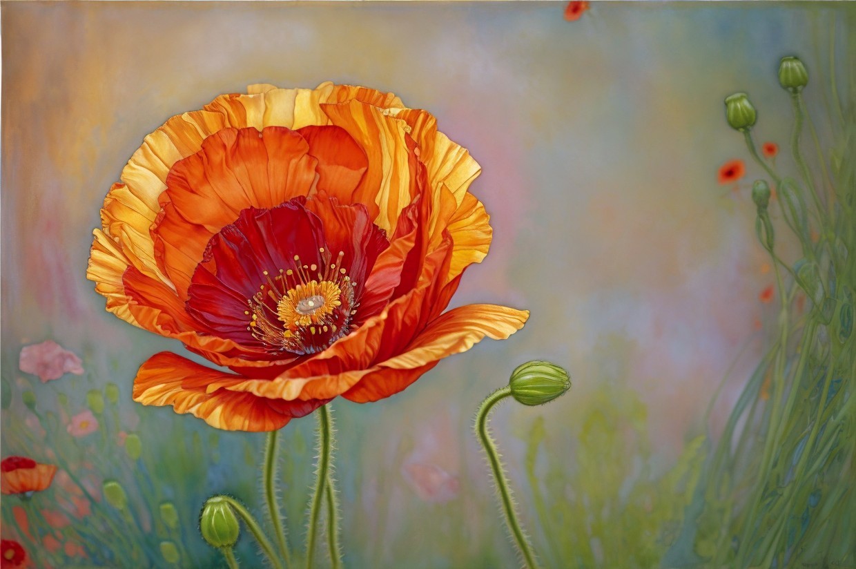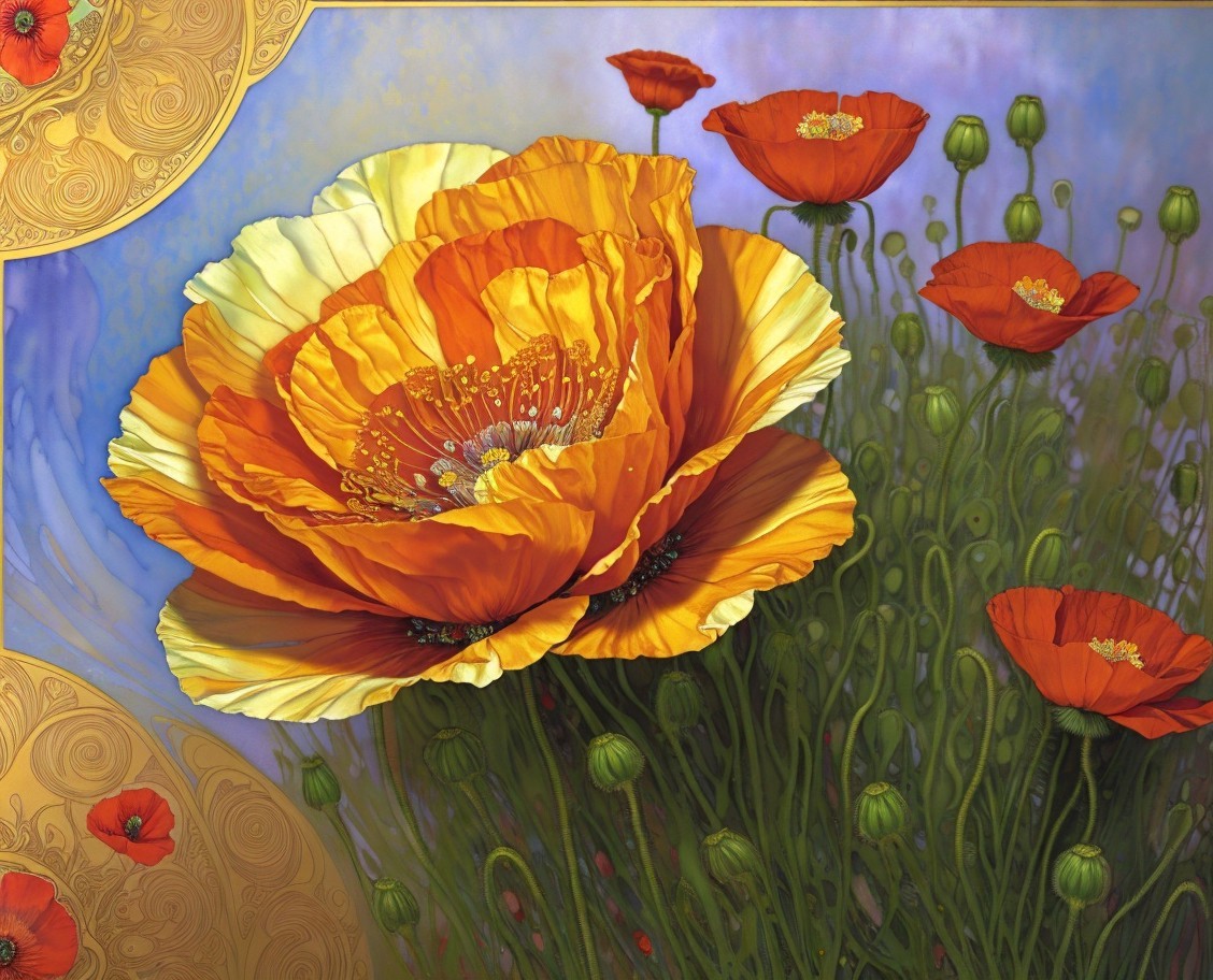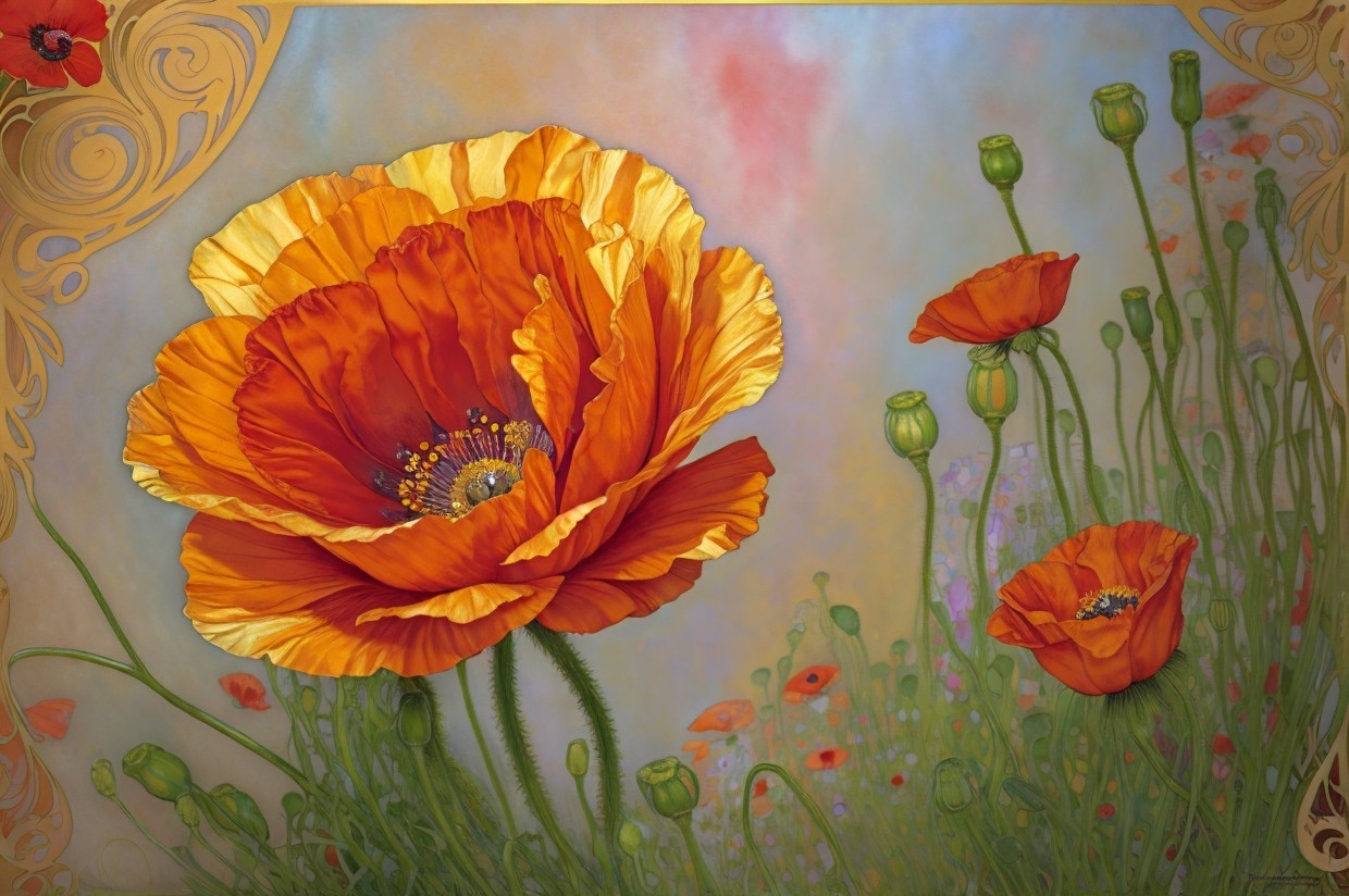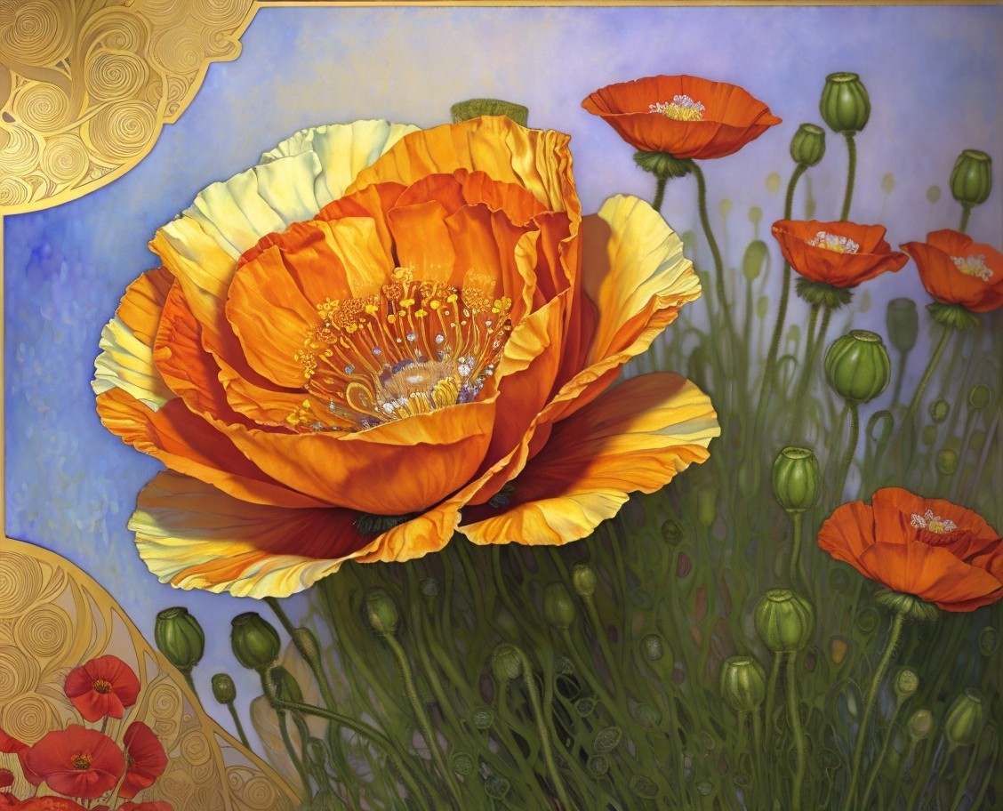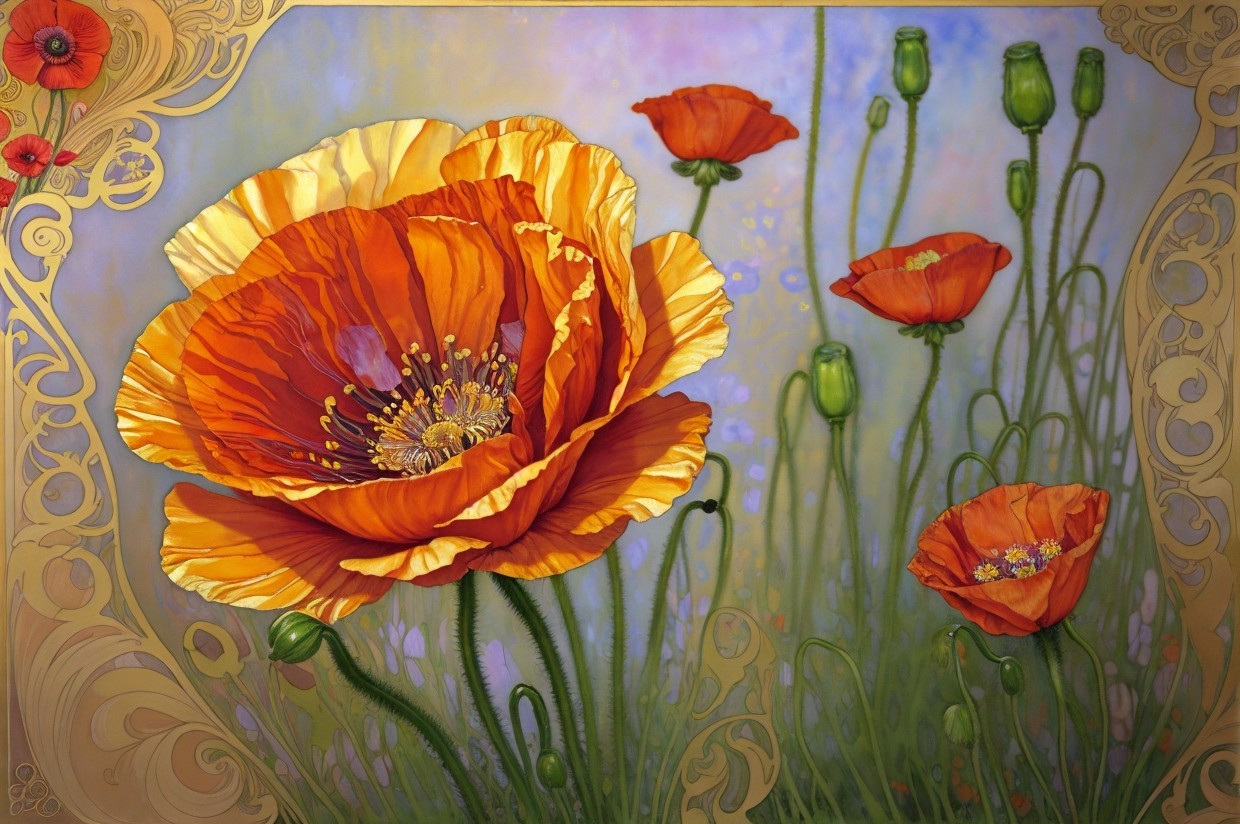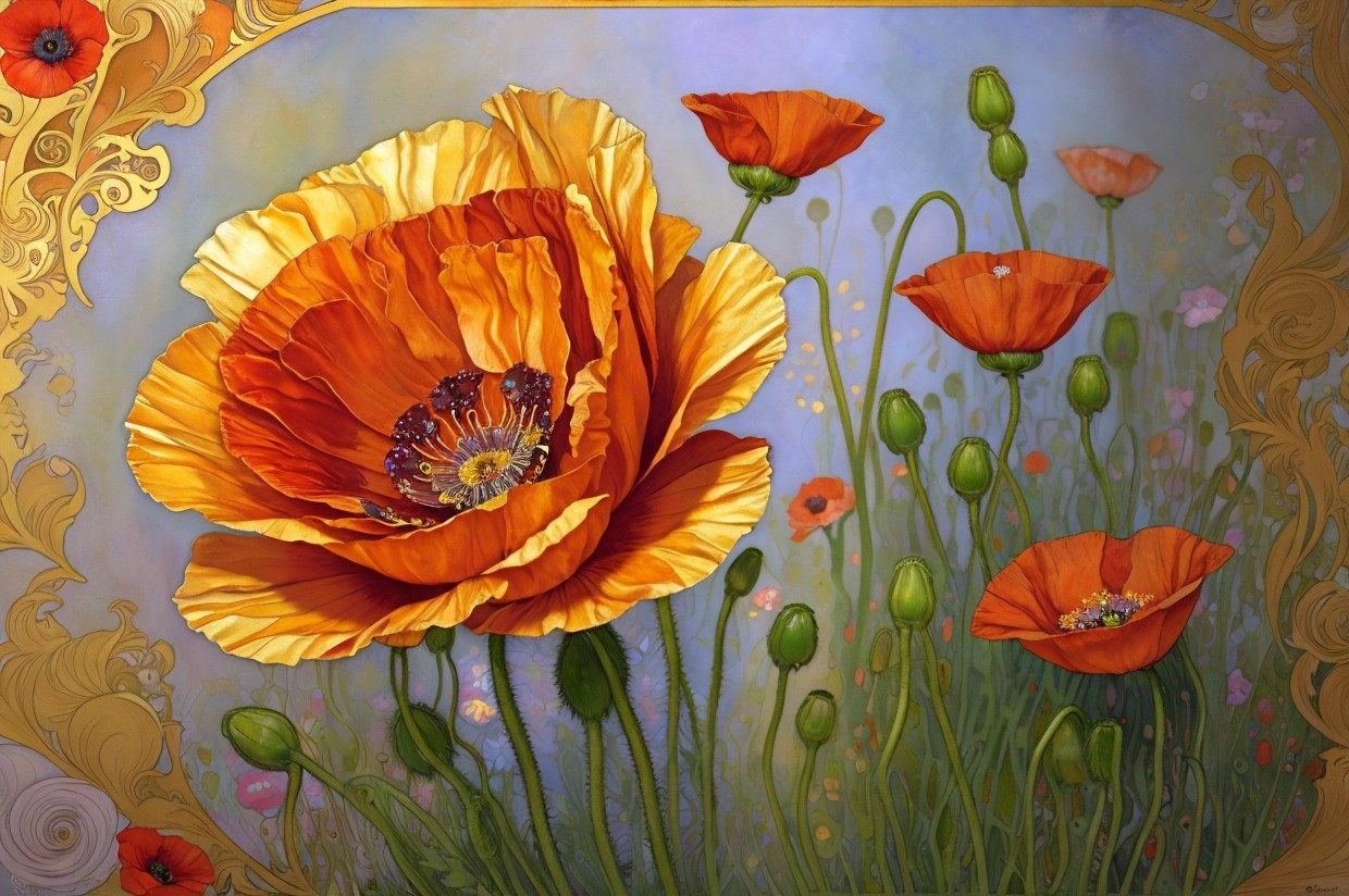 A vibrant illustration of orange and yellow poppies, set against a soft, colorful background. The blossoms feature intricate details, while buds and stems create a lush, lively arrangement.