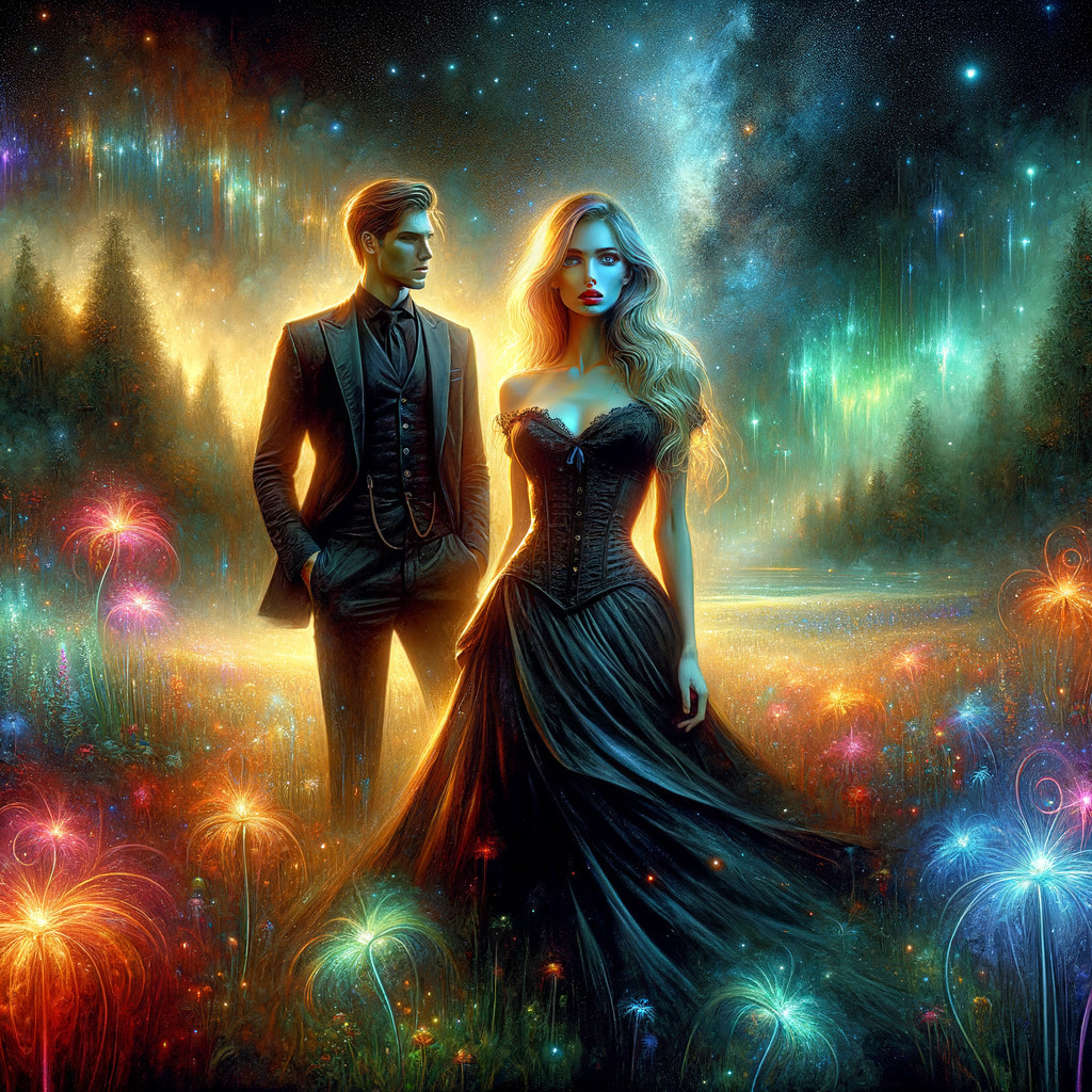 Prompt: "A couple standing in a beautiful meadow. His companion was a beautiful lady simply but startlingly clad in black. Her dress moulded itself to an enticing figure. her face had a taunting beauty, he could believe, he had dreamed of, flashed red with anguish.Starry Night time.