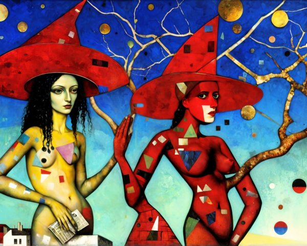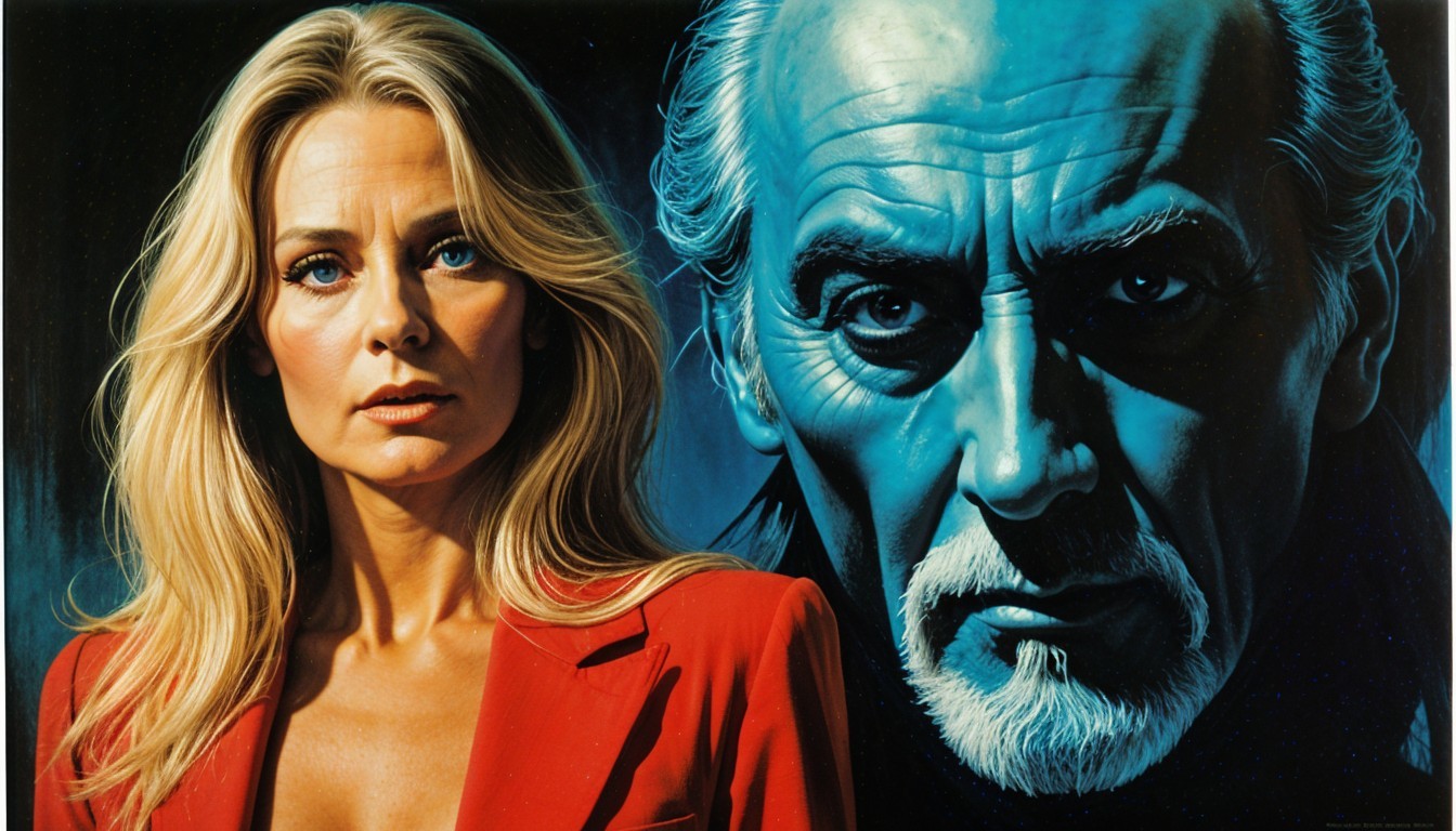 The image features a striking portrait of a woman with long blonde hair, wearing a red outfit, alongside a dramatic depiction of a stern man with blue-toned skin and a serious expression.
