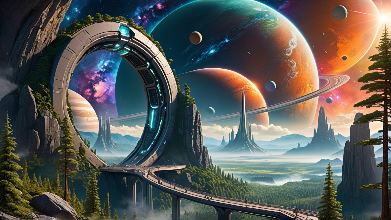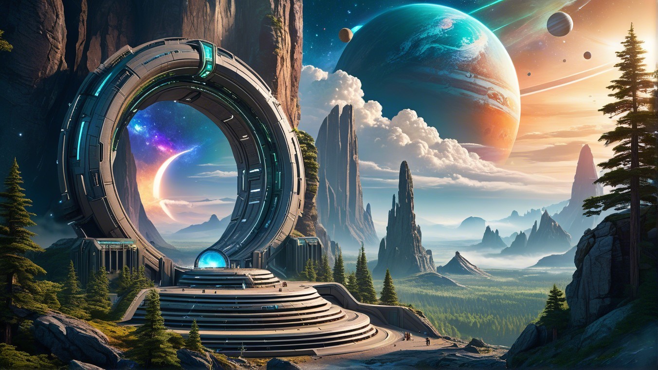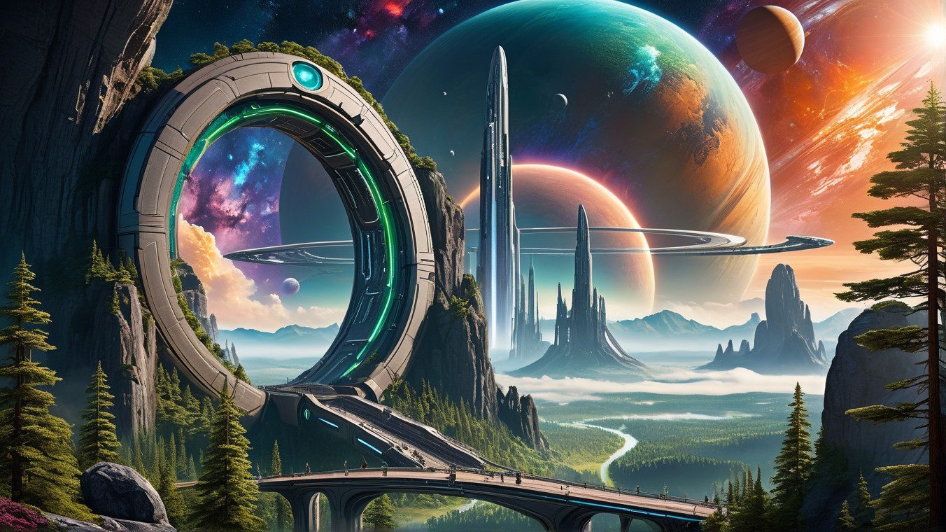 A breathtaking sci-fi landscape features a massive futuristic archway surrounded by vibrant planets and rings, towering mountains, and lush forests, creating an otherworldly atmosphere.