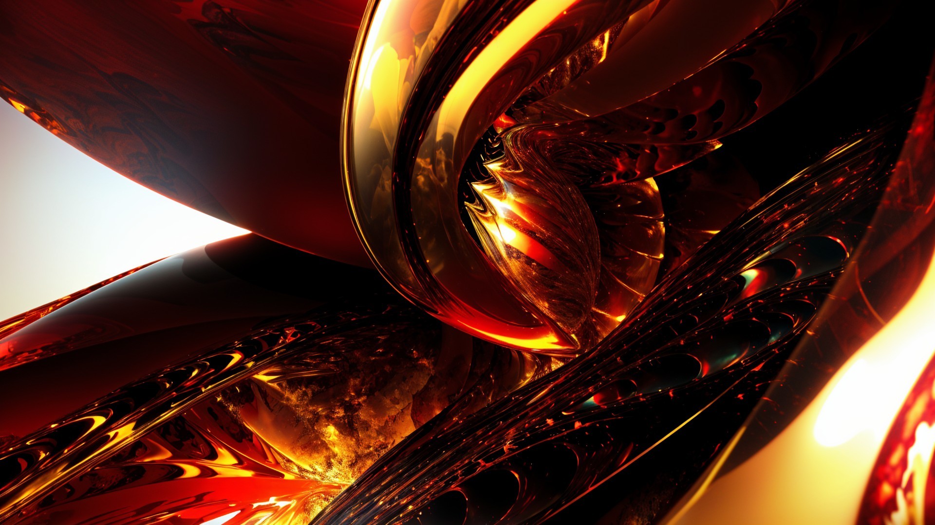 A captivating abstract composition featuring swirling metallic shapes in deep red and gold hues. The smooth, reflective surfaces create an illusion of depth and movement, drawing the viewer in.