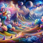 A vibrant landscape features a giant, colorful face made of flowing hair, surrounded by lush valleys, blooming flowers, and two figures in traditional attire walking towards a cosmic sky filled with stars.