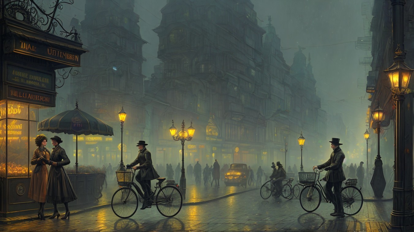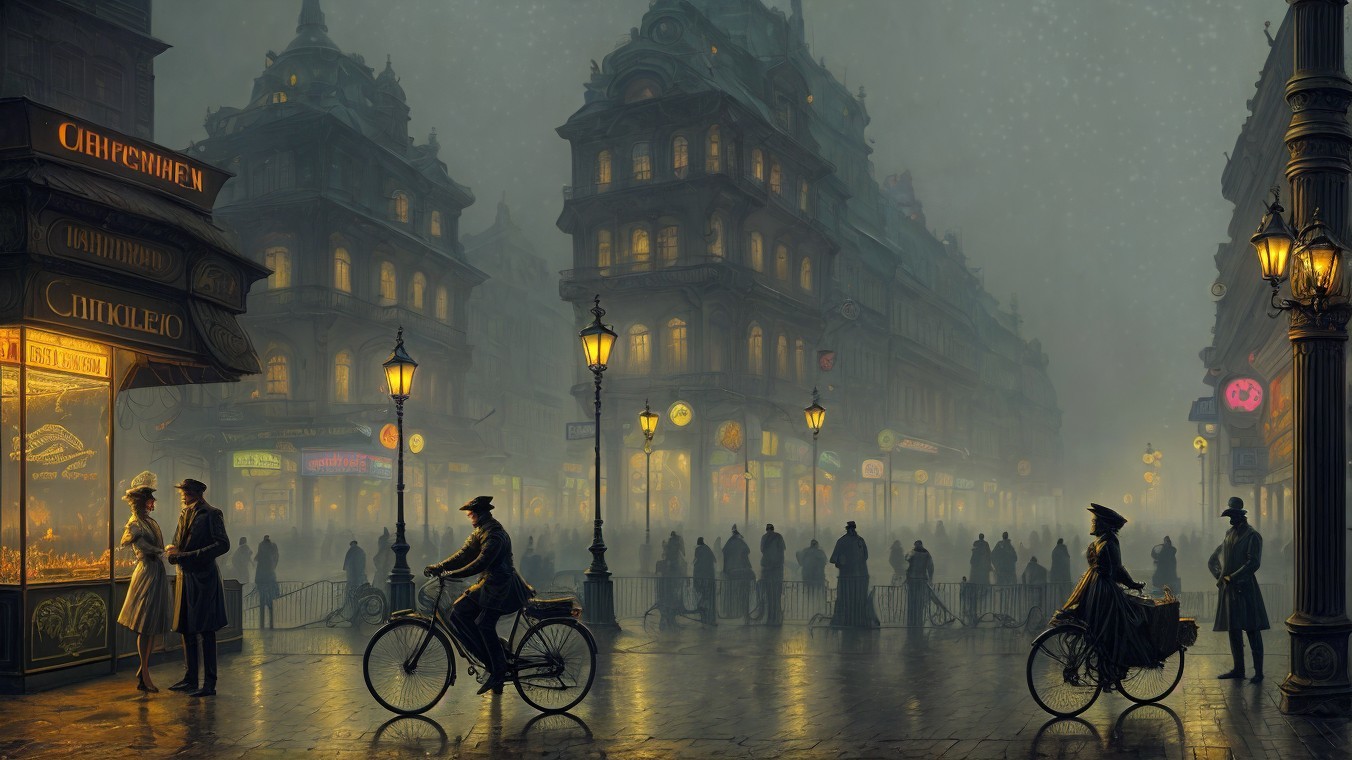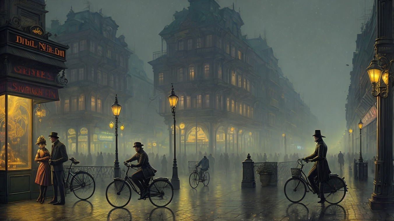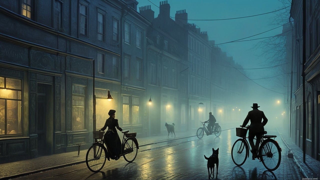 A foggy, moonlit street scene featuring vintage architecture, softly glowing street lamps, and silhouettes of people in period attire, some on bicycles, creating a nostalgic atmosphere.