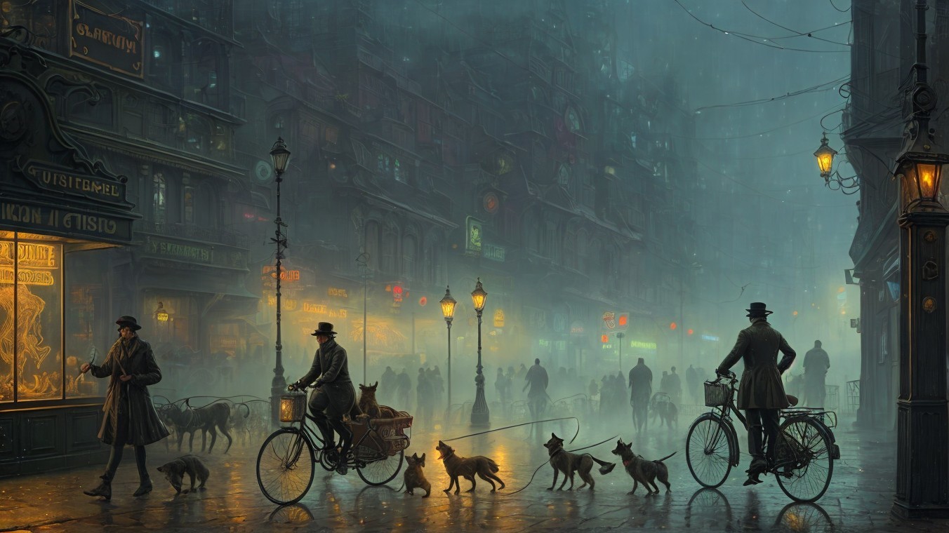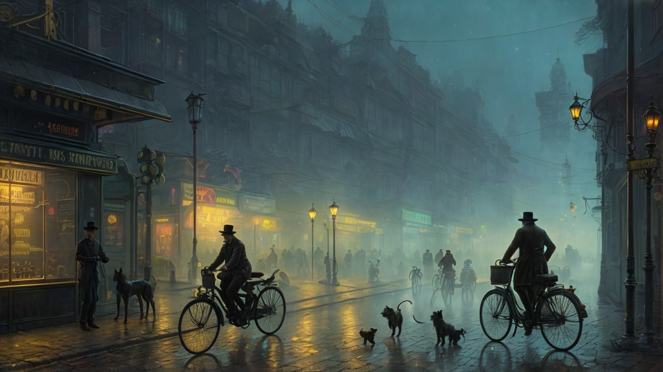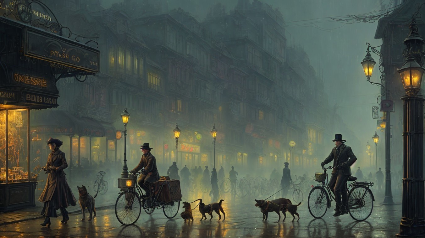 A foggy, moonlit street scene featuring vintage architecture, softly glowing street lamps, and silhouettes of people in period attire, some on bicycles, creating a nostalgic atmosphere.