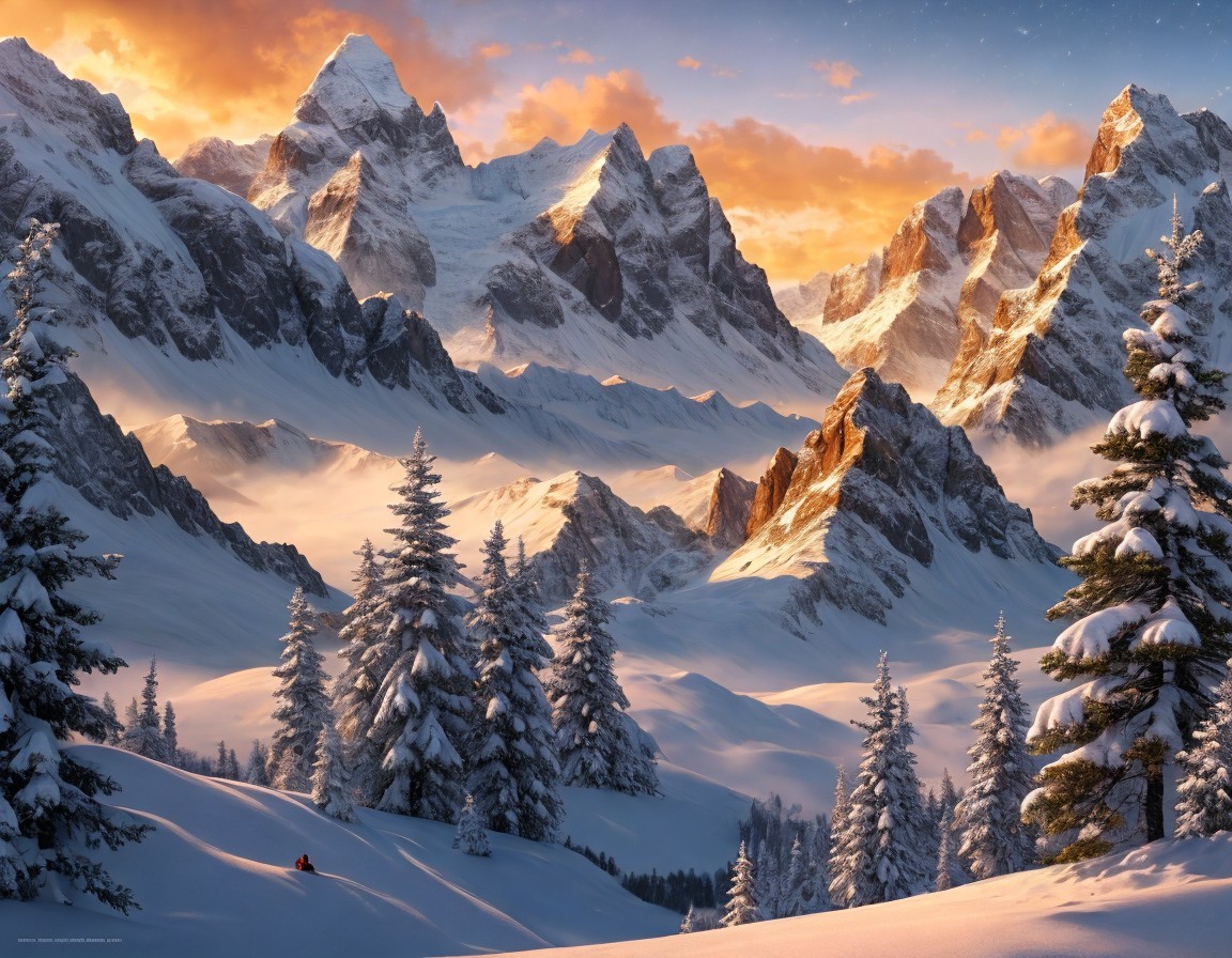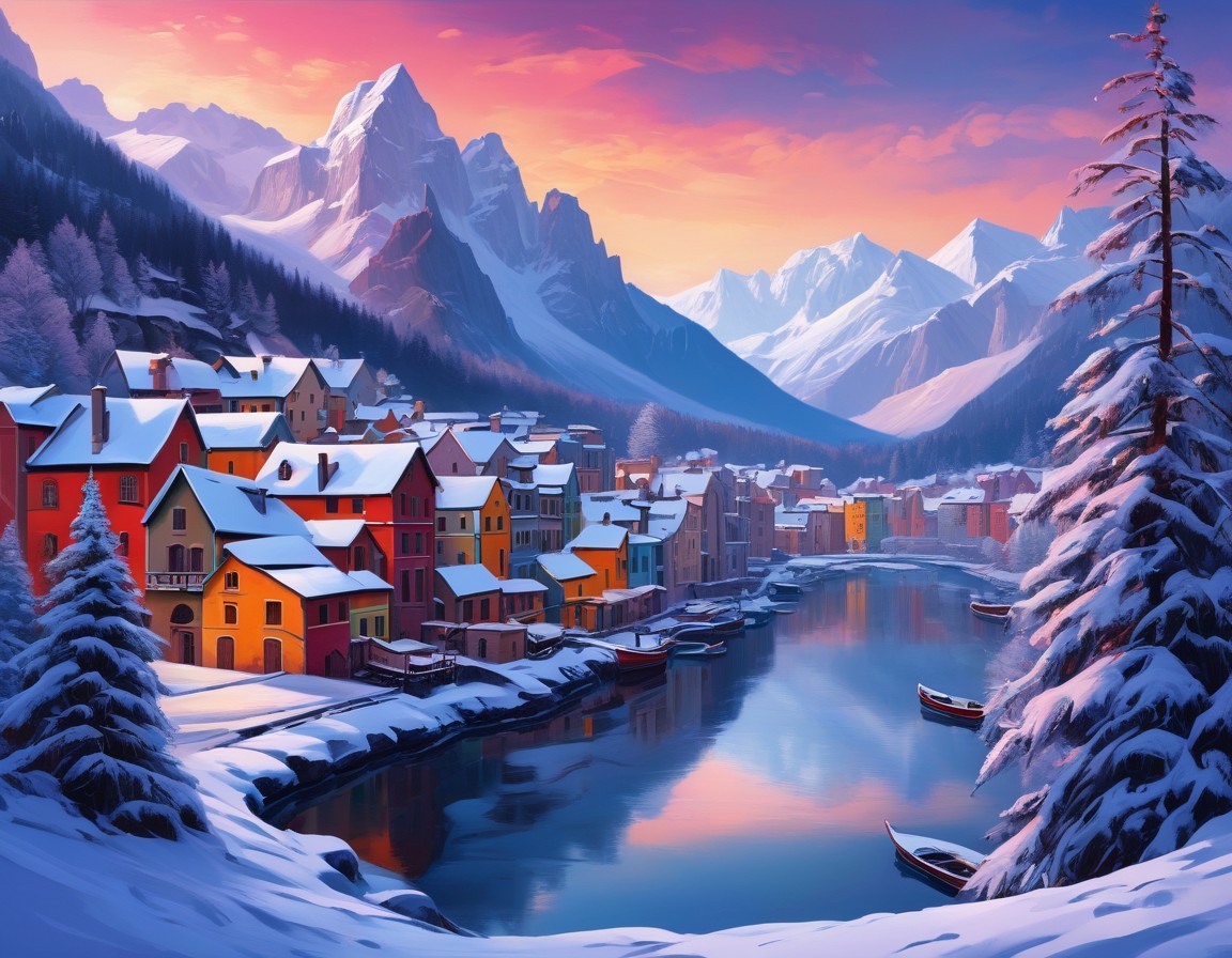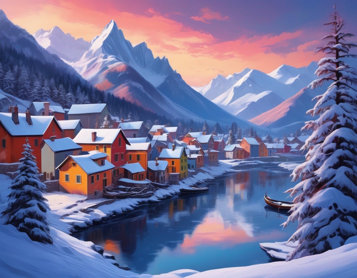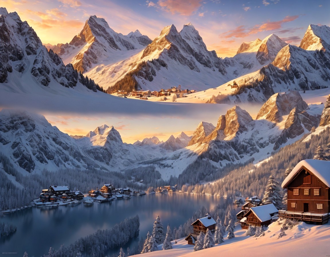 A picturesque winter scene featuring snow-covered mountains, a serene lake, and charming wooden chalets nestled among frosty trees, illuminated by the warm glow of a sunset.