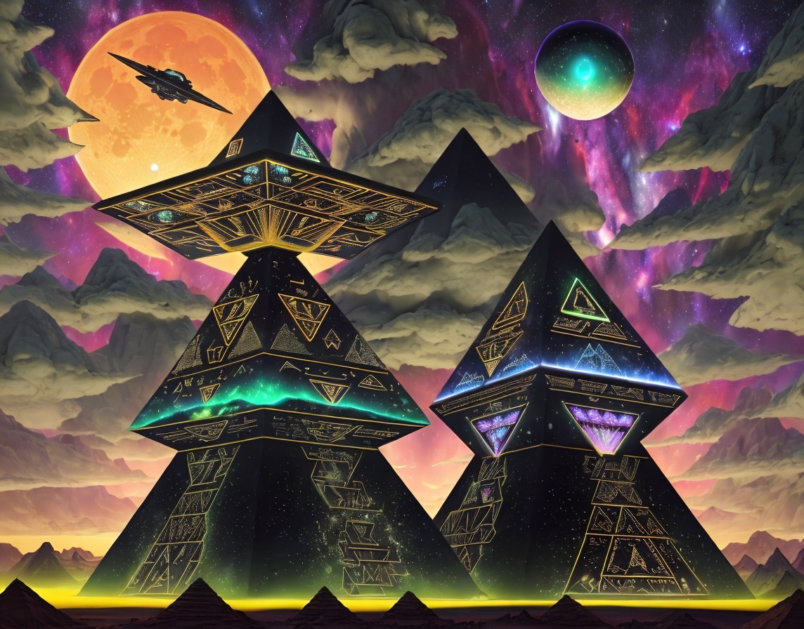 + Prompt:Extraterrestrial pyramid covered in intricate alien glyphs and assimilated with advanced technology. Illuminated by phosphorescent crystals adorned with hexagonal geometric patterns. The sun, moon, and planets amidst billowing nebula clouds in a vast cosmic sky. Ultra-realistic landscape beneath this complex celestial canvas, immersing yourself in the enigma of astral projection, alien contact, and surreal psychedelic vibes inspired by the sci-fi LSD art aesthetic. In the style of Cameron Gray