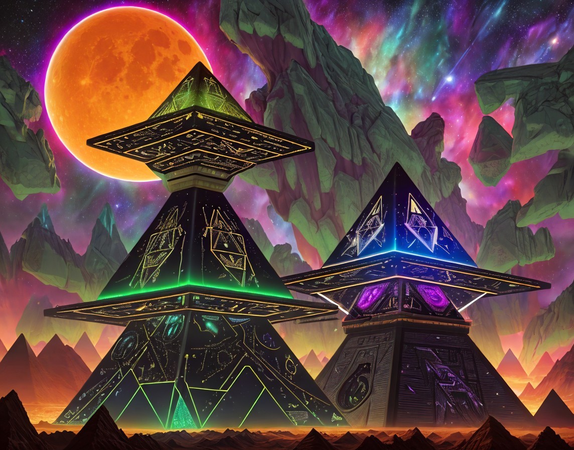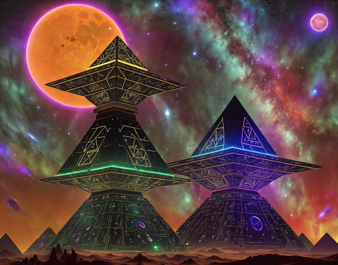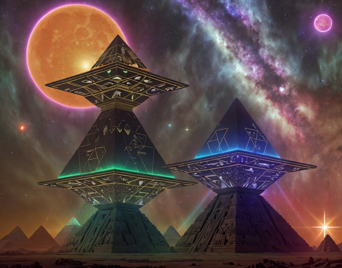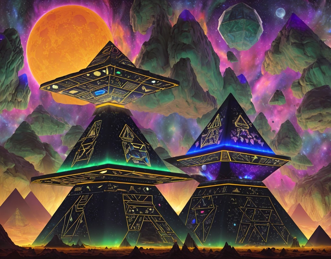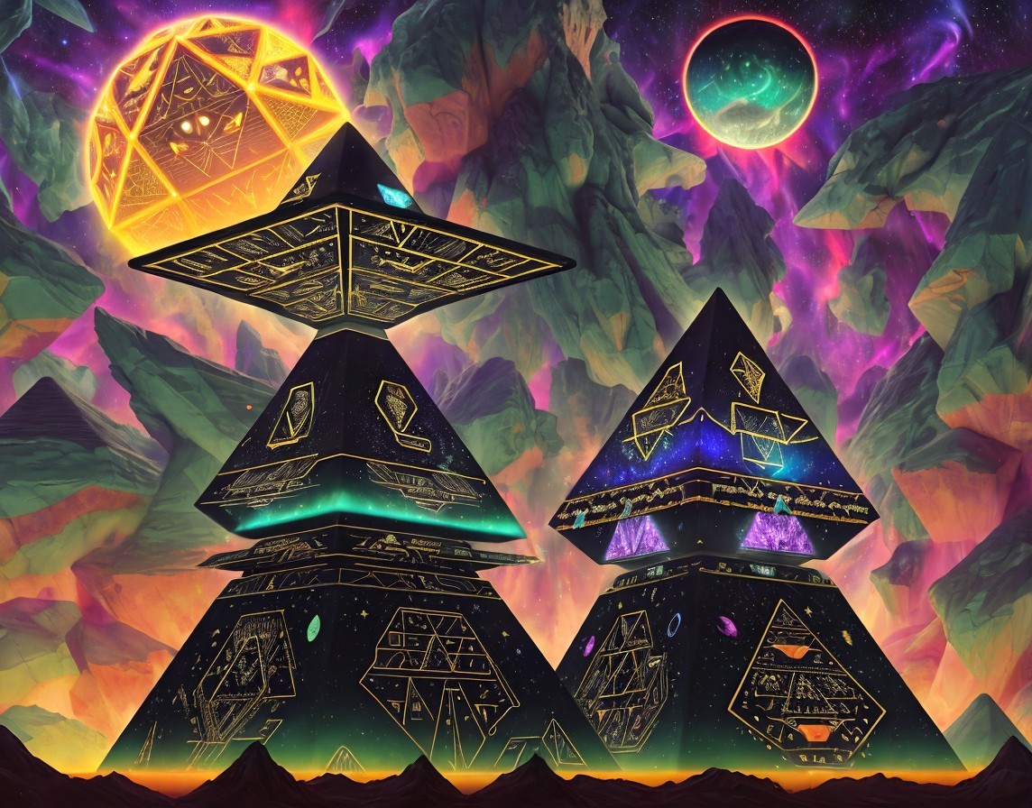 Extraterrestrial pyramid covered in intricate alien glyphs and assimilated with advanced technology. Illuminated by phosphorescent crystals growing from the ground. Landscape adorned with hexagonal geometric patterns. The sun, moon, and planets amidst billowing nebula clouds in a vast cosmic sky. Ultra-realistic landscape beneath this complex celestial canvas, immersing yourself in the enigma of astral projection, alien contact, and surreal psychedelic vibes inspired by the sci-fi LSD art aesthetic. In the style of Cameron Gray