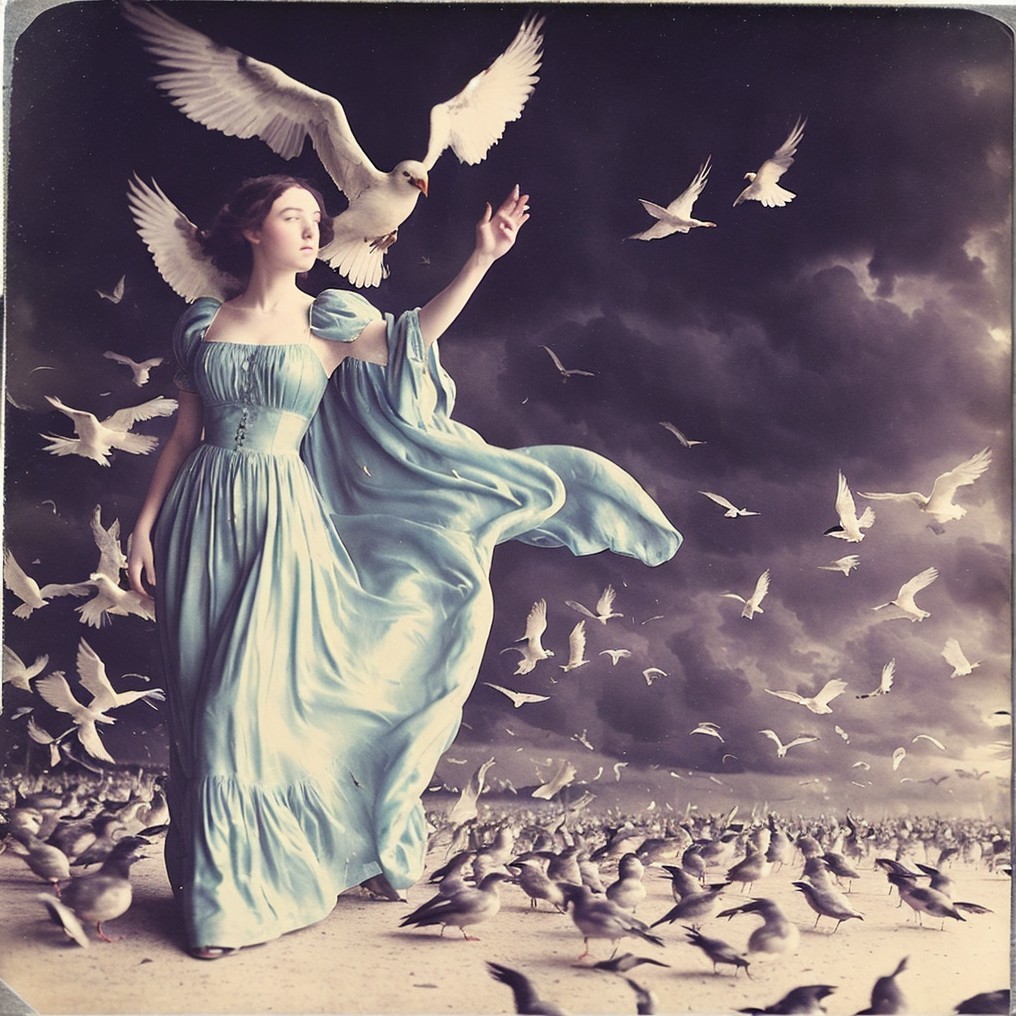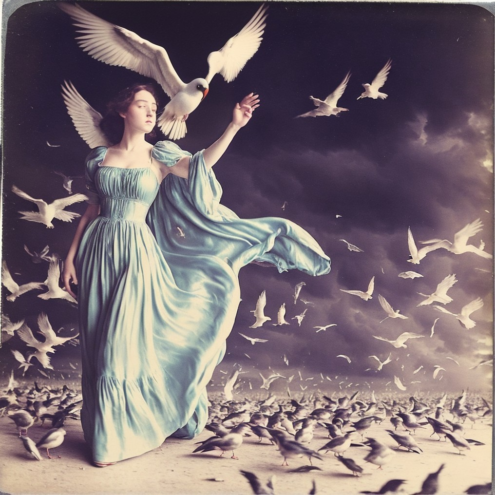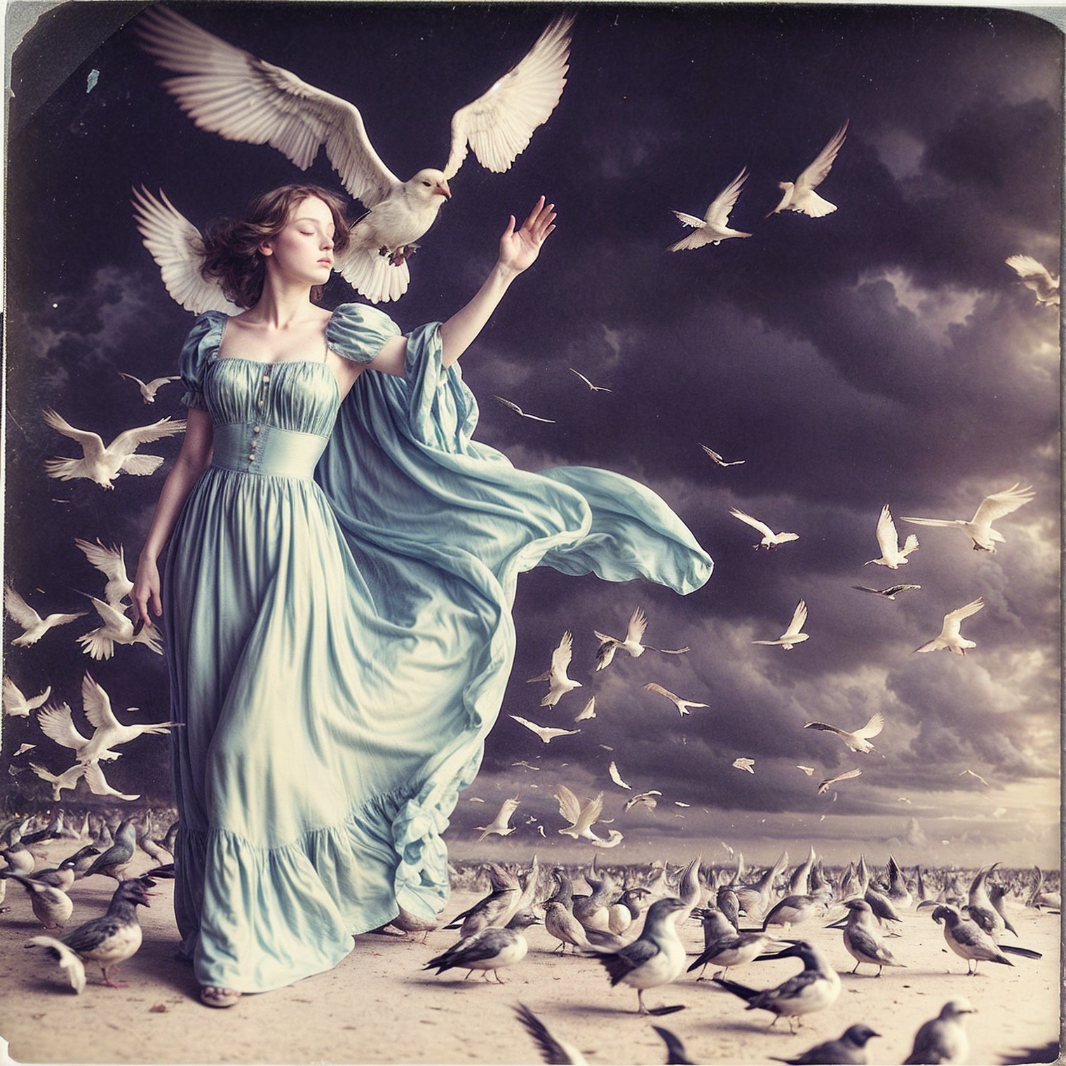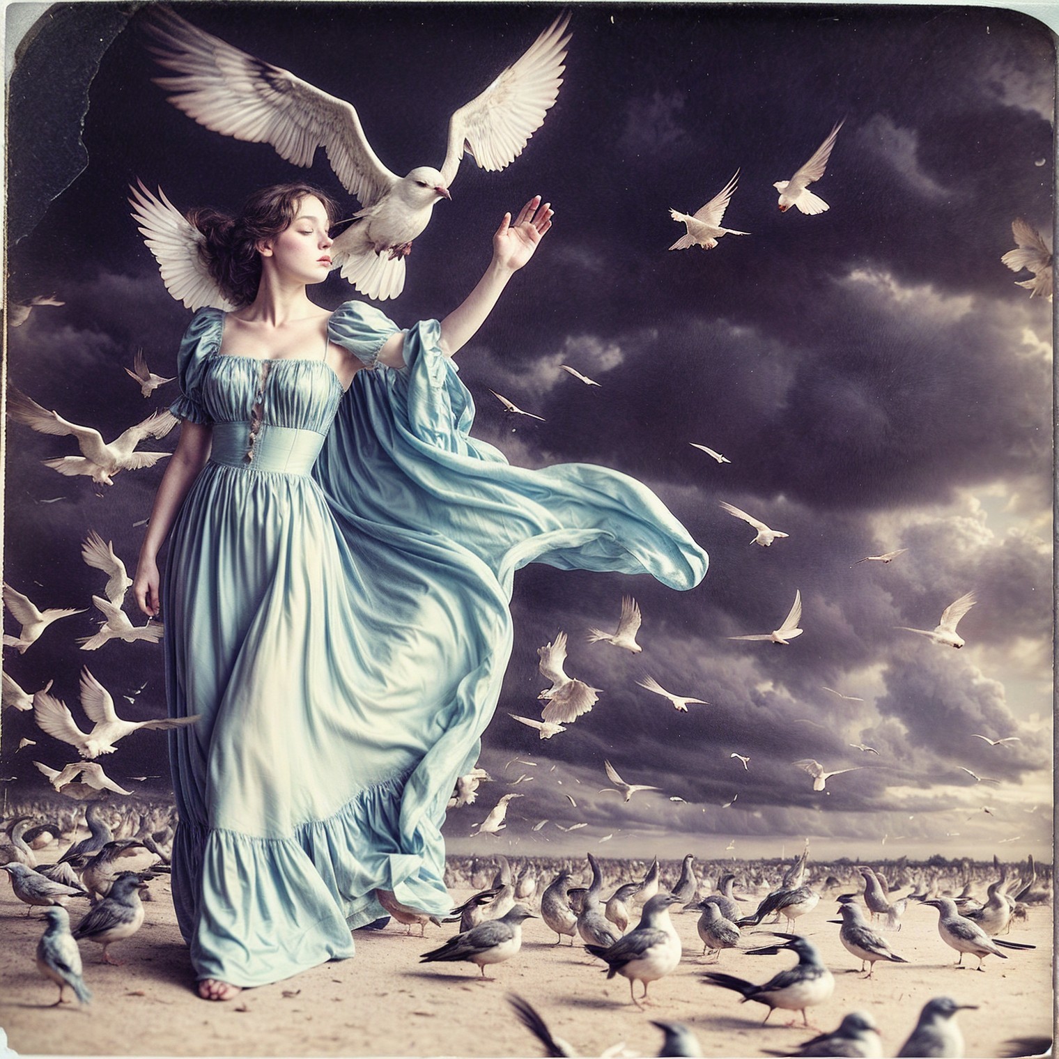 A woman in a flowing blue gown stands amidst a flurry of birds, reaching out as they soar around her against a dramatic, cloudy sky. The scene conveys a sense of freedom and enchantment.