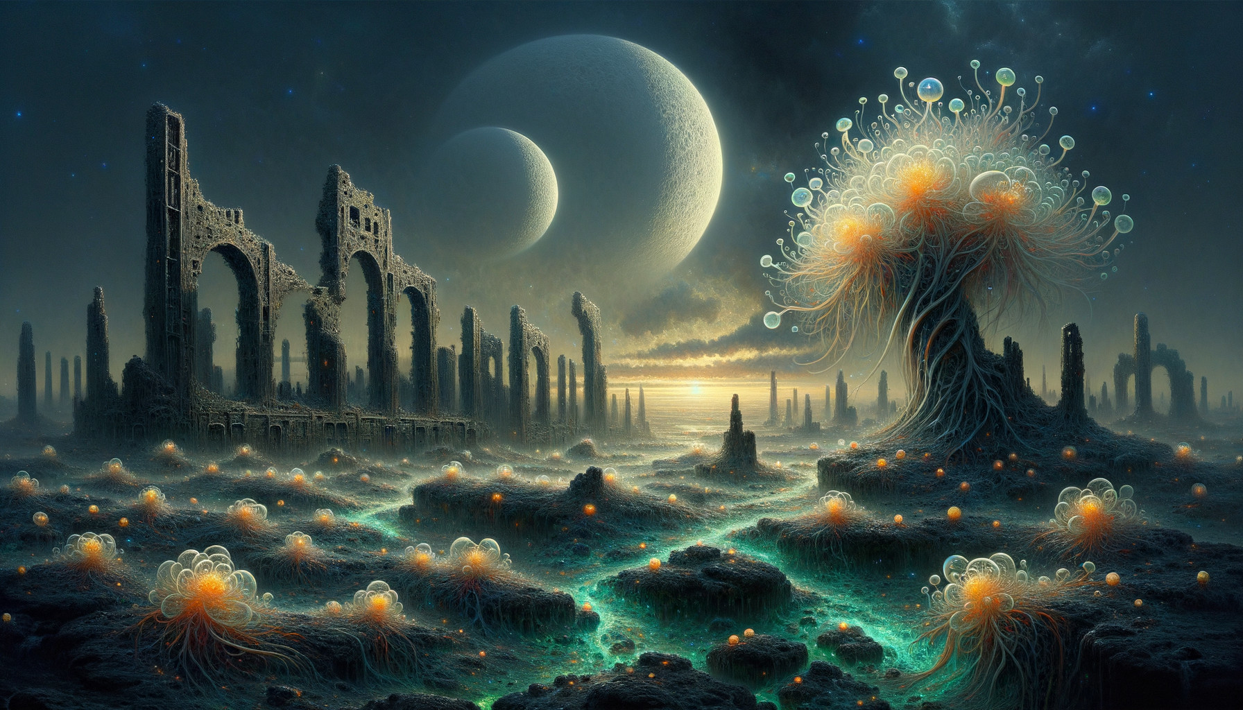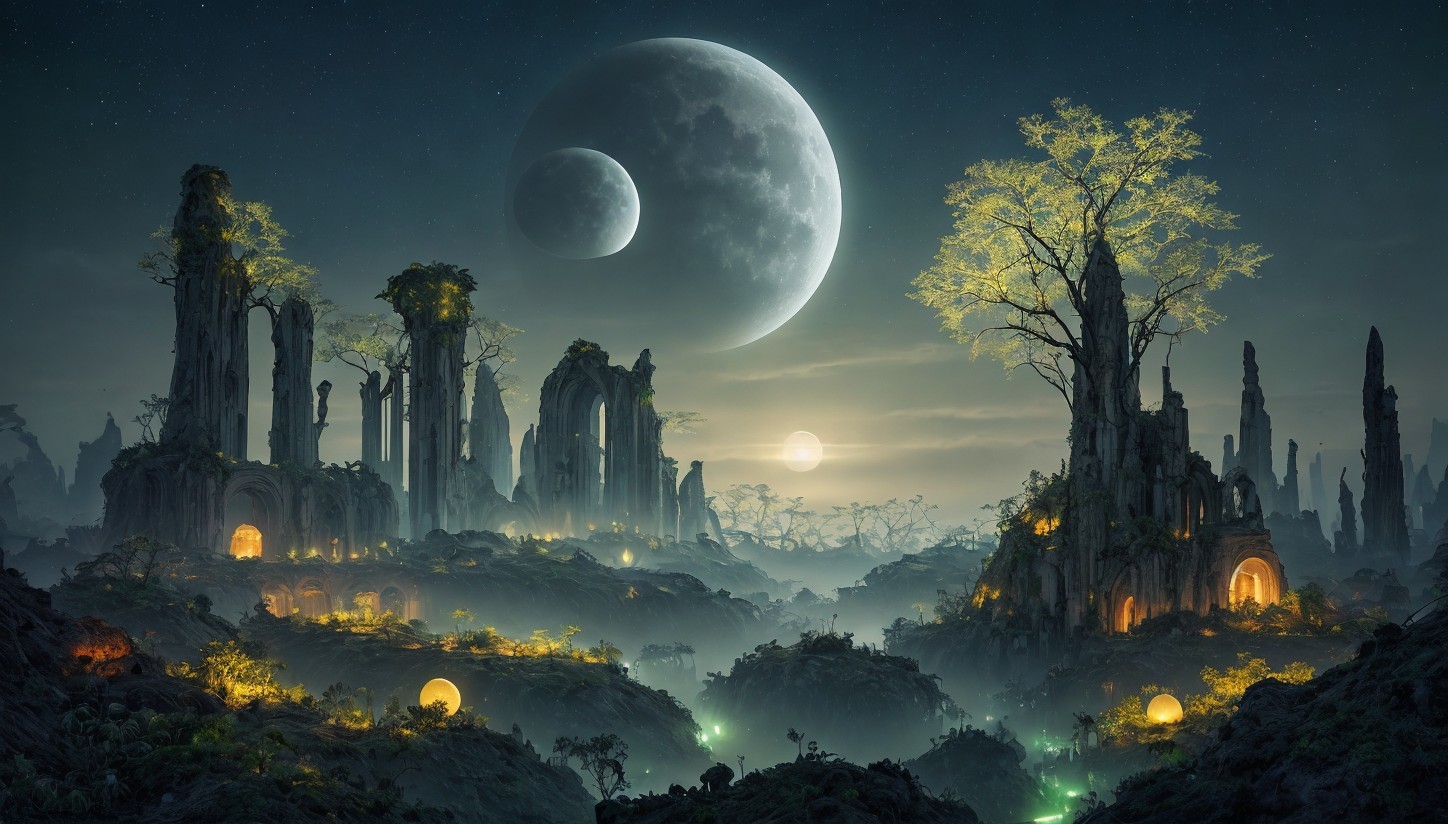 A fantastical landscape with towering rock formations, verdant trees, misty valleys, and a large moon hovering above.
