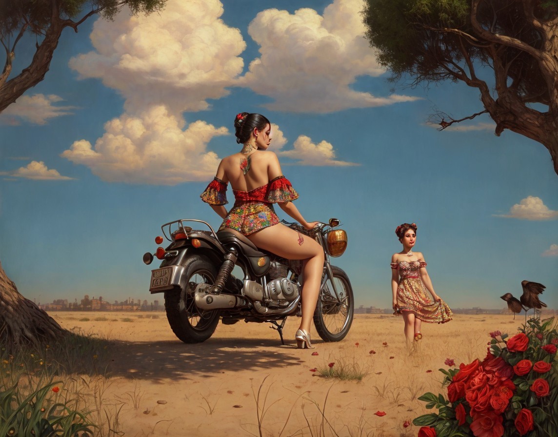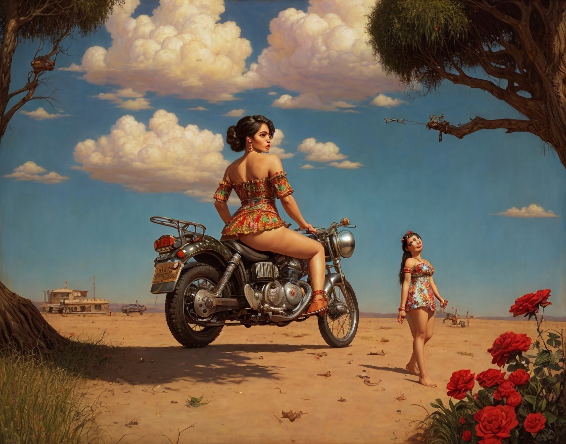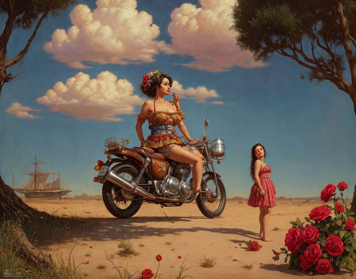 Here is the description as proposed by DDG: "A woman adorned with flowers and jewelry holds a golden mask, with a cityscape in the background."