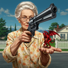 An elderly woman holds a large gun in one hand and a small, menacing red devil in the other, set against a suburban backdrop with a white picket fence. The scene is surreal and striking.