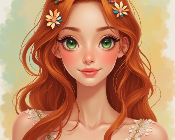A young woman with flowing, wavy hair adorned with pink flowers gazes softly at the viewer. Her warm skin tone contrasts beautifully with the vibrant orange and gold background.