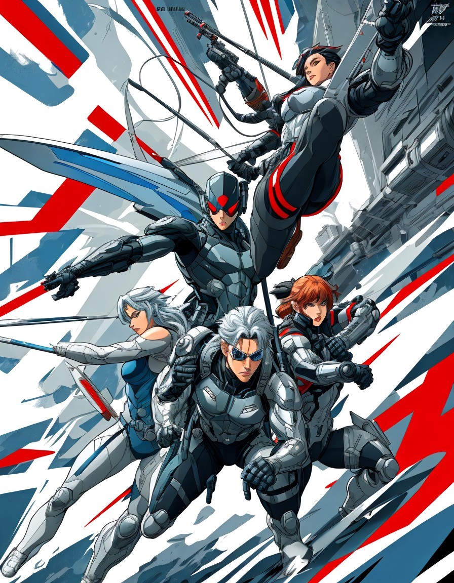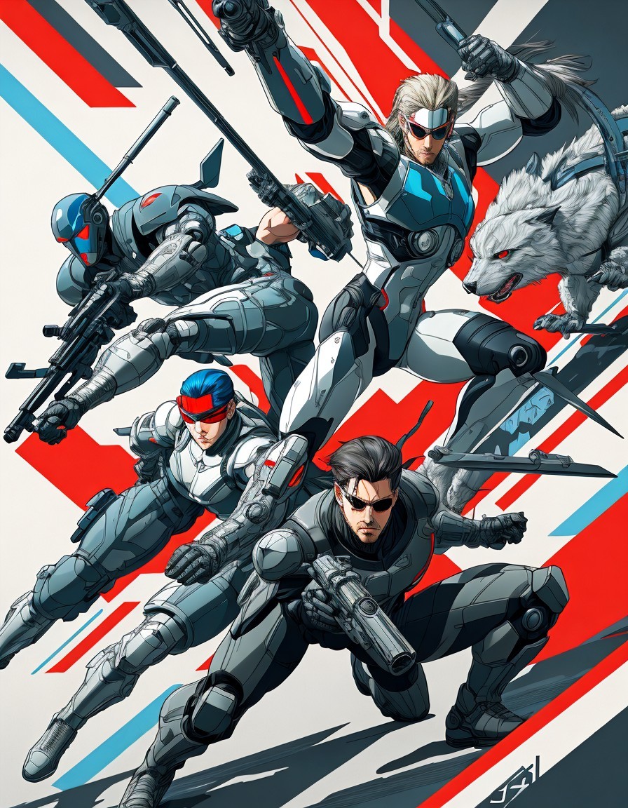 + Prompt:metal gear trio,, dynamic pose, art deco, cel shaded, irregular angle view, organic tropic cybernetic with futuristic modern silver blue white red colors, patriotic themed, defined, neat, contrast, detailed, realistic badass 3d illustration, comics art/extremely-ultra-detailed line-art. The artwork features high contrast, colorful, striking detailed art style, outline, no text