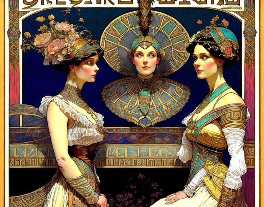 Prompt: Elegant Victorian ladies looking at ancient egypt mummy and sarcophagi, Crystal Palace, vintage historical exhibition ads poster, oil on canvas masterpiece by Mucha, Bilibin, Leyendecker, codex seraphinianus, fantasy, art nouveau