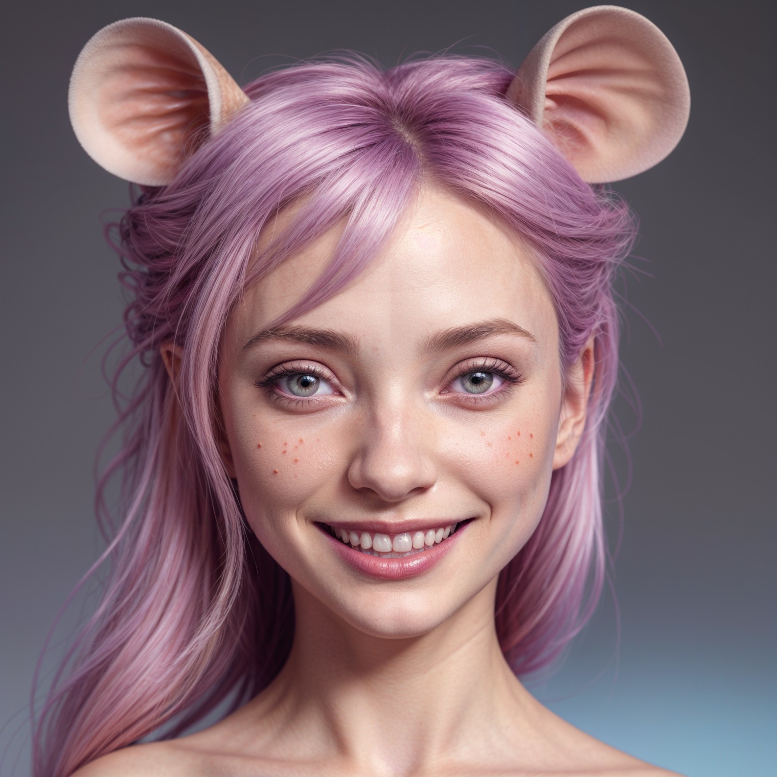 A cheerful girl with rainbow-colored hair and playful ear accessories smiles brightly. Her makeup features soft shades, and she is surrounded by floating bubbles, exuding a whimsical vibe.