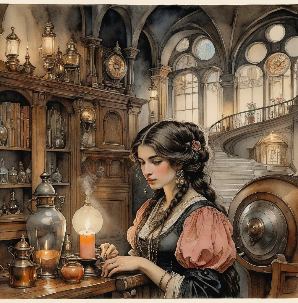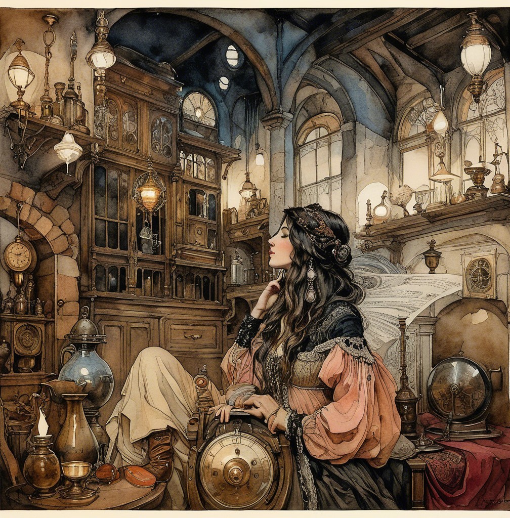 . Gypsy lady in the House of the spirits. , colored ink drawing, watercolor artwork on old withered paper, vintage, by Caravaggio, Fragonard, Anton Pieck, pale colors, high detail, intricately detailed, hyperdetailed volumetric lighting, art nouveau graphic steampunk ., whimsical, beautiful, poignant, touching. colors blush bronze, black. soft watercolor extra water in magical realism by Annigoni, Egon Schiele, Milo Manara, Botticelli, Catrin Welz-Stein, Jean Metzinger, Klimt, perfect eyes, perfect handsface, highly detailed, complementary colors, hyper detailed. Watercolor and ink splatter, dynamic pose, dark blue background, unreal engine, alphonse mucha, global illumination, detailed and intricate environment Beautiful woman in the style of Pino Daeni Dorota Piotrowiak Edward Gorey, junji ito, klimnt , gold leaf color, silver leaf color beautiful dynamic lighting high definition hdr * Random prompt award winning Max Ernst ultra detailed 4K 3D Texture