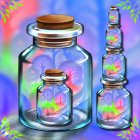 A collection of transparent jars of varying sizes sits against a soft gradient background. Each jar holds vibrant autumn leaves and has a cork stopper, creating a whimsical, serene scene.