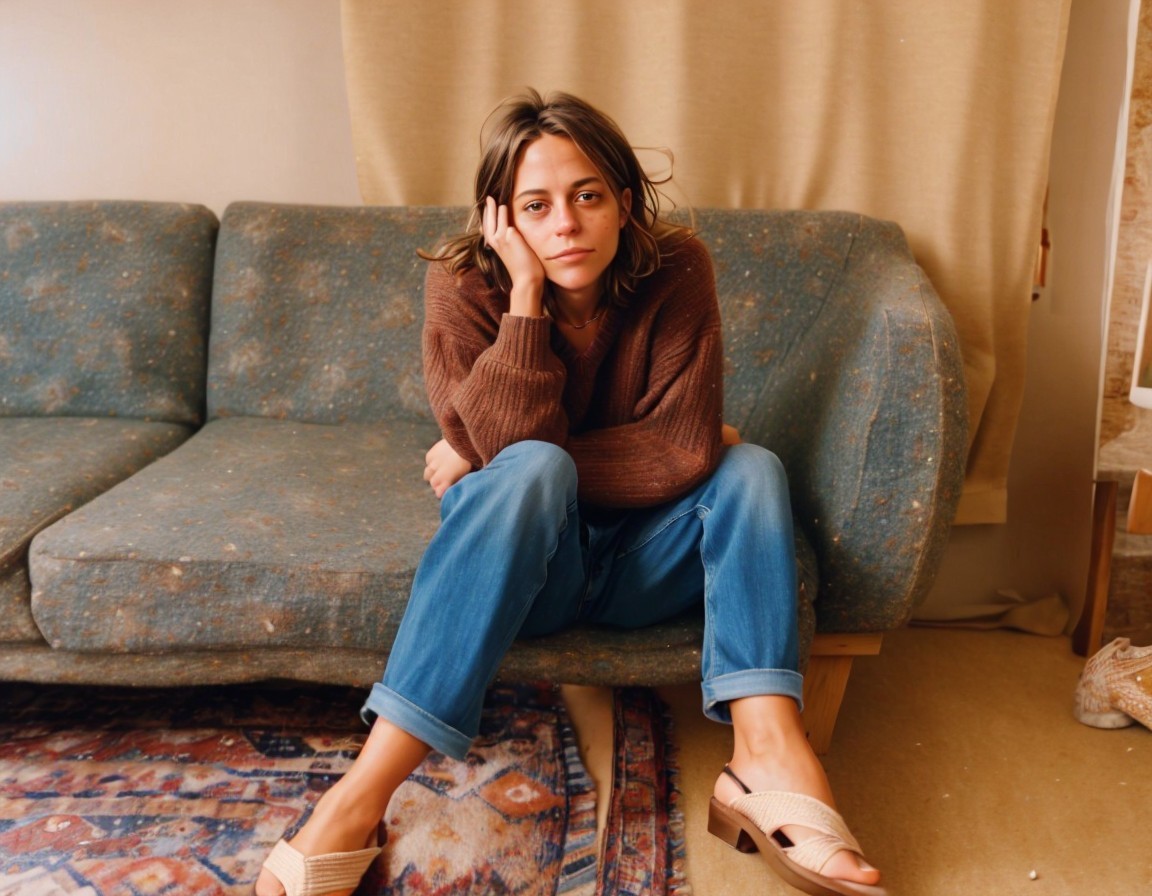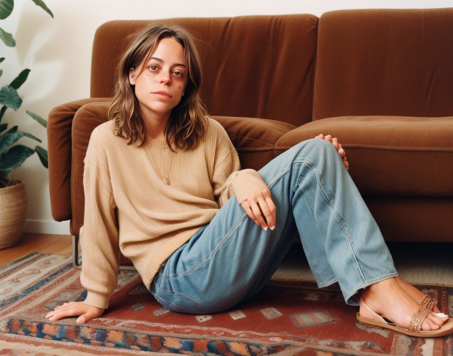 A person in a beige sweater and pants sits on the floor beside a couch, wearing blue slippers and looking pensive.