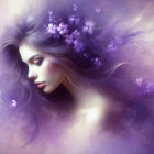 The artwork features a serene woman with long, wavy purple hair, set against a soft, circular background. A crescent moon adds a dreamy ambiance, enhancing the mystical feel.