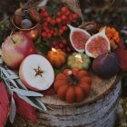A vibrant autumn display features colorful pumpkins, apples, figs, and chestnuts on a rustic wooden stump, surrounded by marigolds and autumn foliage. A candle adds warmth to the scene.