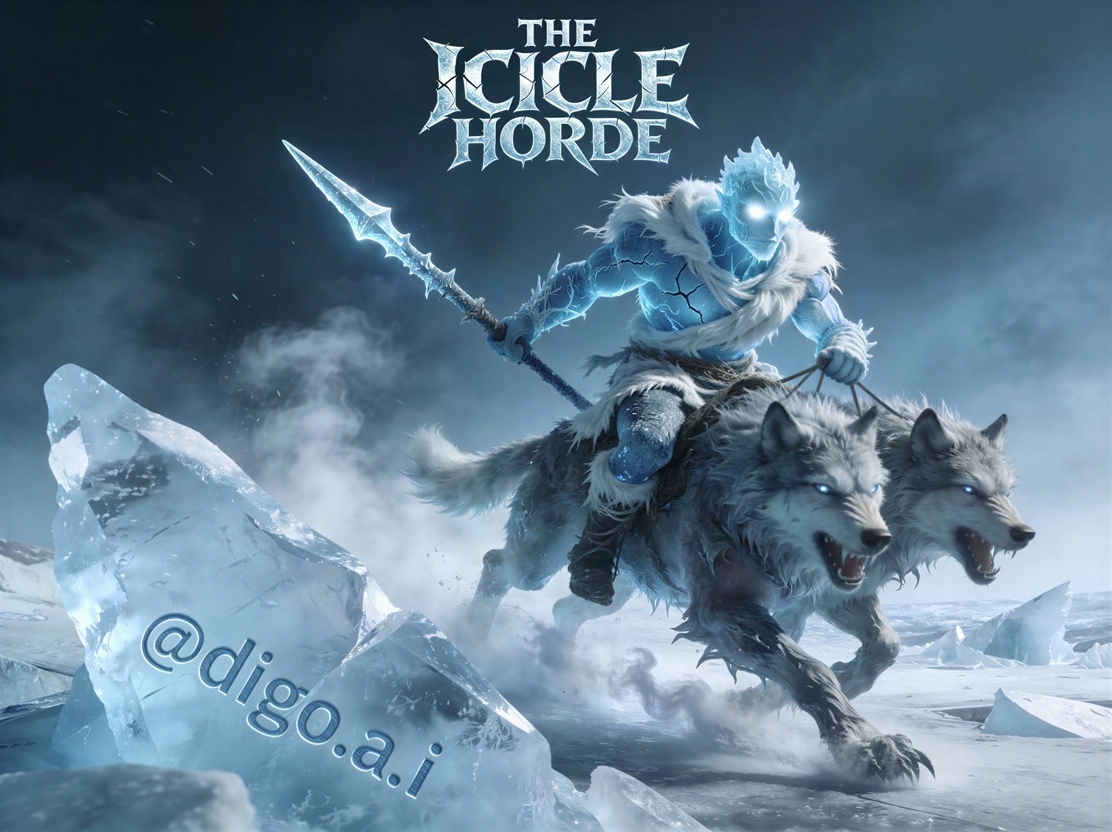 An ice warrior with glowing blue cracks on his skin that resemble ice shards, and glowing white eyes, rides on two ice wolves with glowing blue eyes, holding an ice spear, with a title on the top of the image that says "THE ICICLE HORDE", on a snowy and icy landscape,