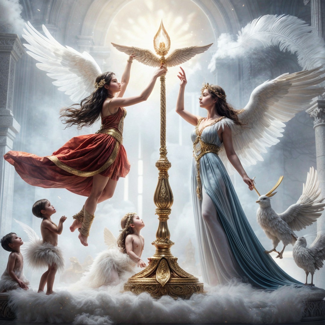 The scene depicts ethereal figures in flowing garments, with wings, surrounded by mist. A golden statue stands tall, while children gaze in awe, a dove symbolizing peace above.