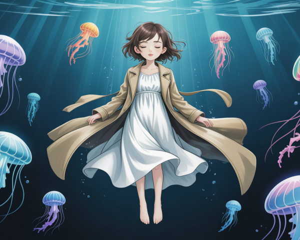 A charming anime girl in a cute basalt-themed nightgown gracefully floats underwater, surrounded by shimmering bubbles and soft light, creating a serene and enchanting atmosphere.