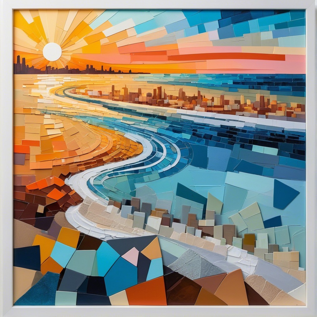The image features a stylized landscape with a winding river leading to a vibrant sunset over a city skyline, blending warm and cool colors in an abstract, layered design.