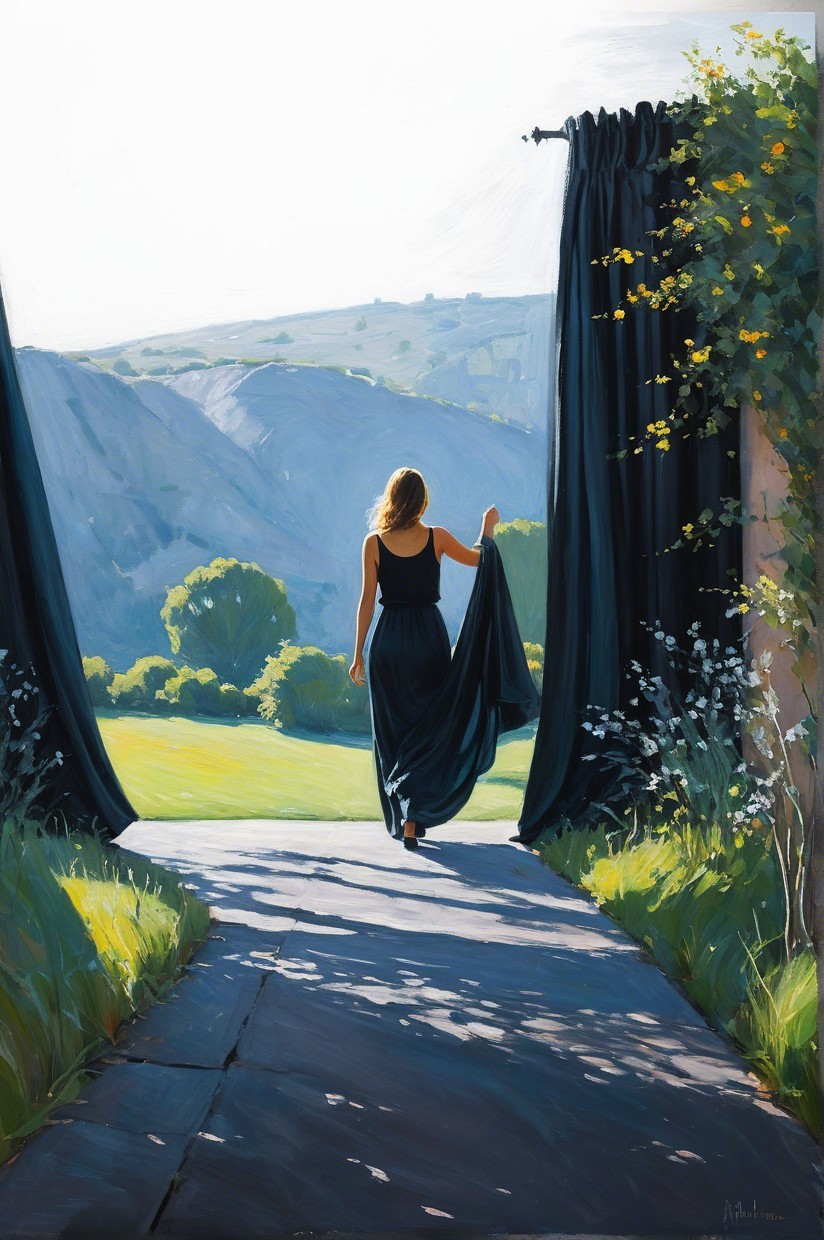 A figure in a flowing black dress walks through a sheer curtain, illuminated by soft, ethereal light. The misty landscape reveals a serene path surrounded by lush greenery.