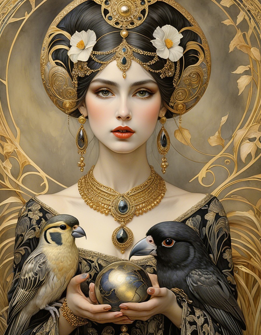 A lady adorned in intricate jewelry stands with two birds, one on each side, holding a decorative sphere. Her elegant attire features floral accents, exuding a mystical and regal aura.