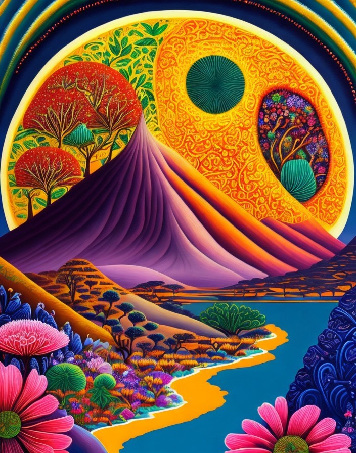 A vibrant, colorful fantasy landscape with a river, flowering trees, a purple mountain, and two suns with intricate patterns in the sky.