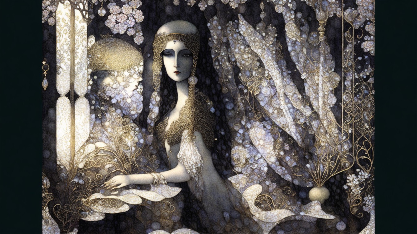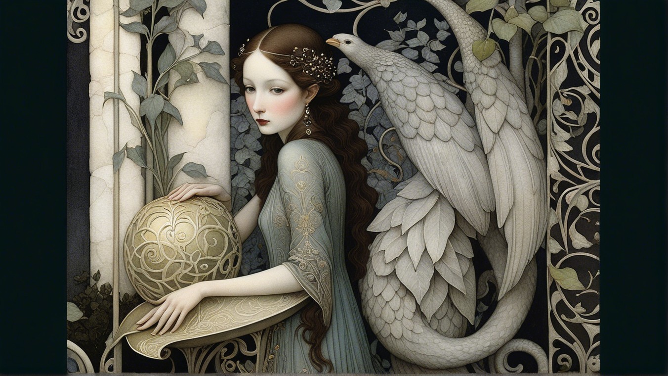 A serene figure in a flowing, intricately designed gown holds a decorative globe. She has long, wavy hair and delicate wings, surrounded by ornate pillars and a swirling, elegant background.
