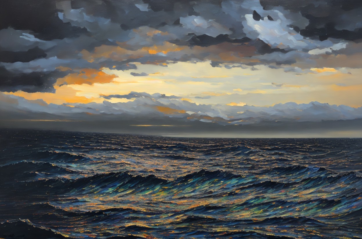 An oil painting of a dramatic seascape with churning dark blue waves under a stormy sky with an opening in the clouds of warm but ominous colors.