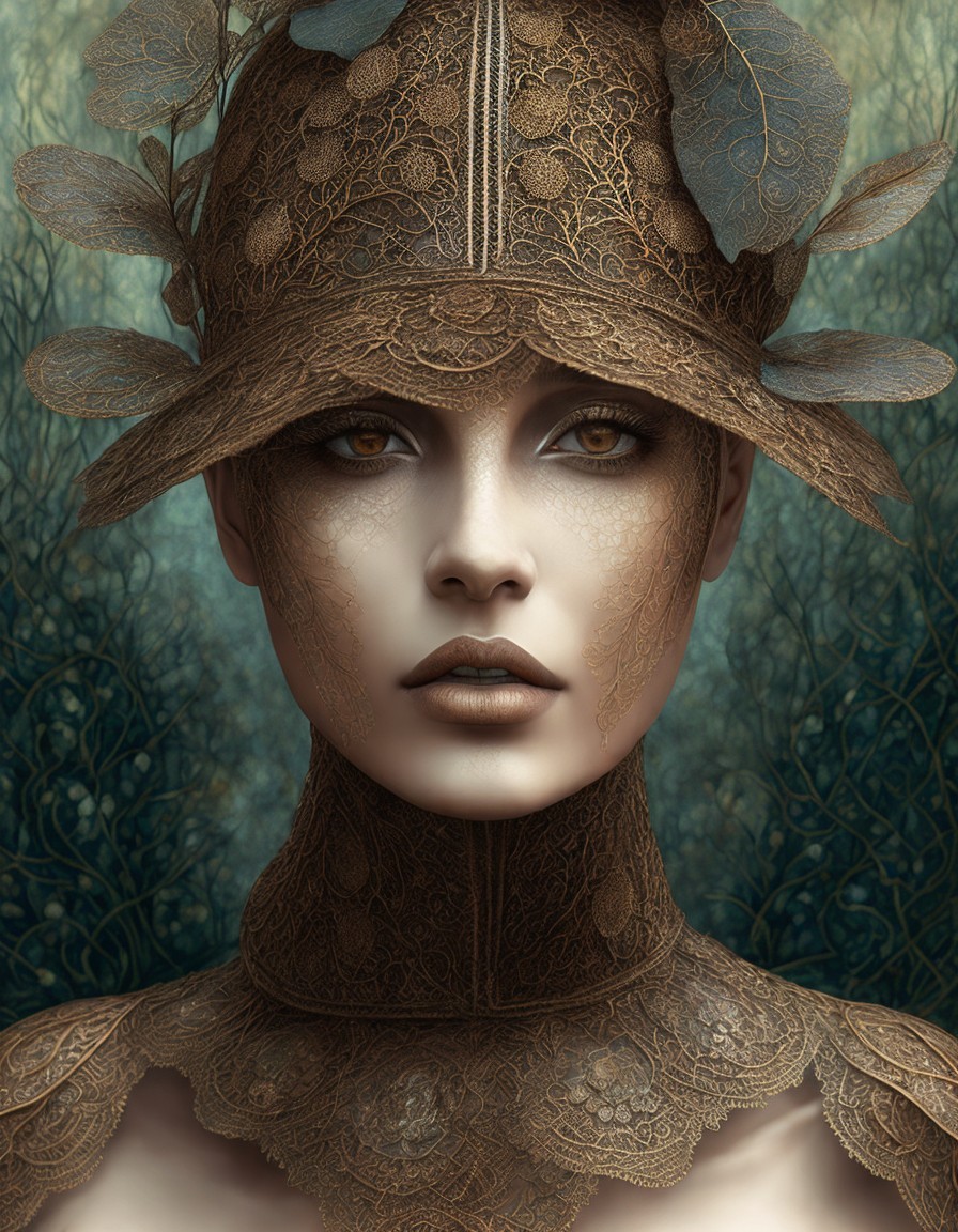 Portrait of a woman with a vintage hat, lace collar, and ornate necklace, featuring soft makeup and a mysterious aura.