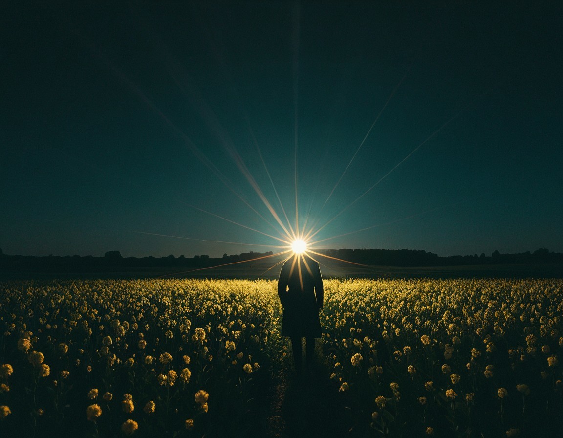 (Inspired by Deception) A figure walks through a vibrant field of flowers under a starry night sky, with a bright light radiating from their head, creating a surreal and dreamlike atmosphere.