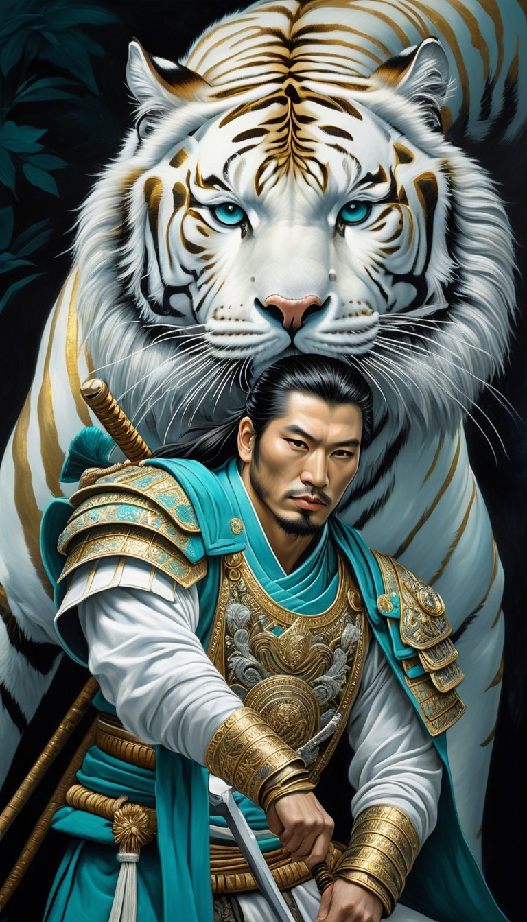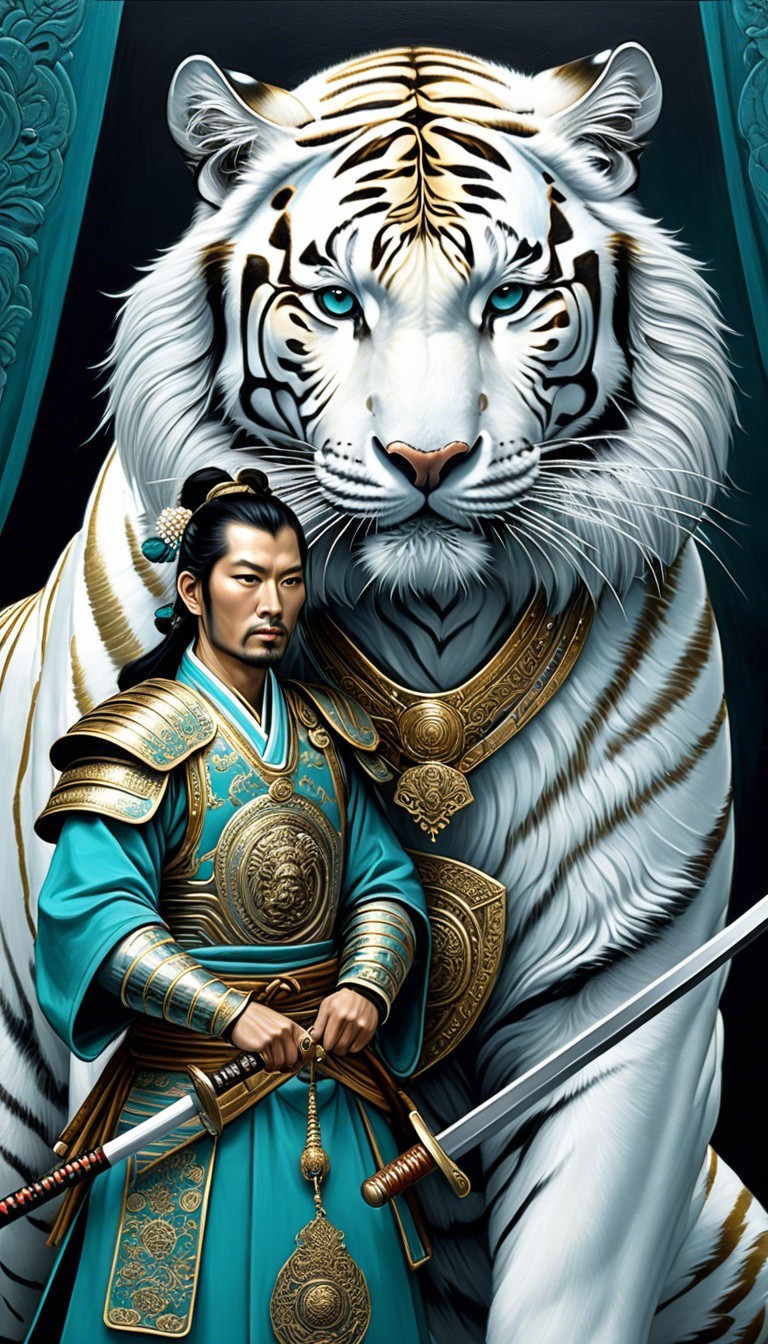 A majestic warrior in ornate teal armor stands confidently between two striking white tigers, embodying strength and elegance, set against a dramatic, colorful backdrop.