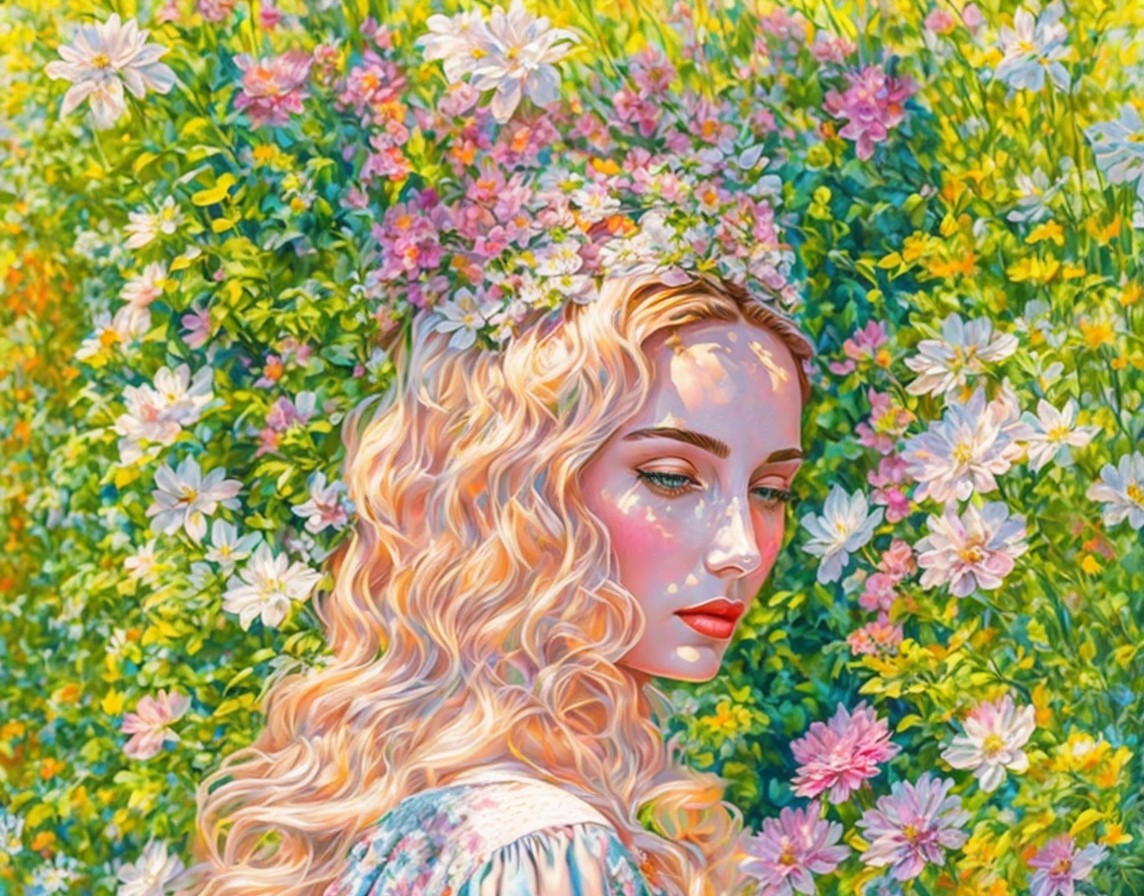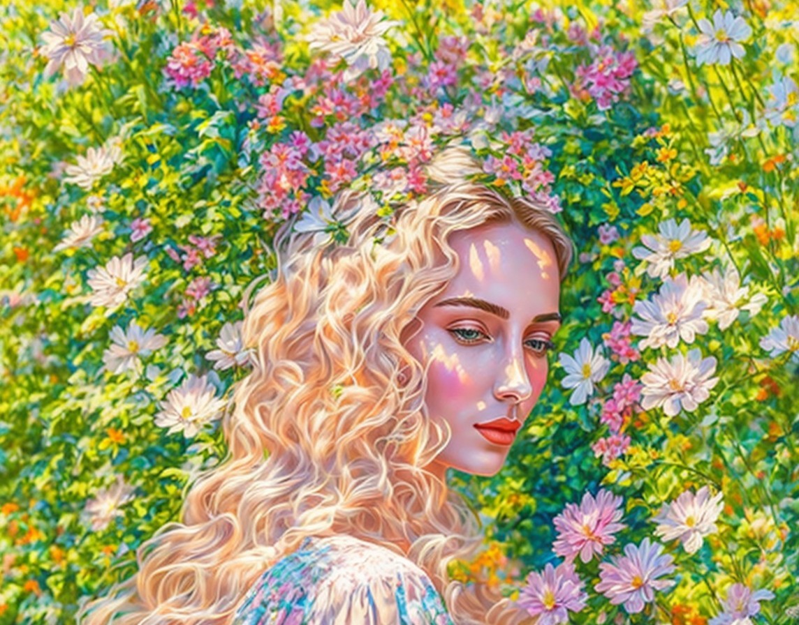 Colorful woman with blonde curly hair in nature-themed illustration.